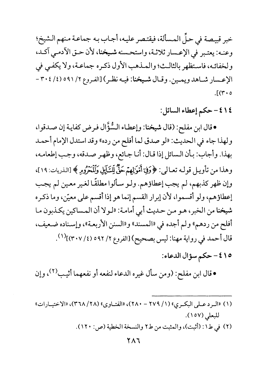 - قال ابن مفلح: (قال شيخنا: وإعطاء السُّؤَّال فرض كفاية إن صدقوا، ولهذا جاء في الحديث: «لو صدق لما أفلح من رده» وقد استدل الإمام أحمد بهذا. وأجاب: بأن السائل إذا قال: أنا جائع، وظهر صدقه، وجب إطعامه، وهذا من تأويل قوله تعالى: {وَفِي أَمْوَالِهِمْ حَقٌّ لِلسَّائِلِ وَالْمَحْرُومِ} [الذريات: ١٩]، وإن ظهر كذبهم، لم يجب إعطاؤهم. ولو سألوا مطلقًا لغير معين لم يجب إعطاؤهم، ولو أقسموا، لأن إبرار القسم إنما هو إذا أقسم على معيّن، وما ذكره شيخنا من الخبر، هو من حديث أبي أمامة: «لولا أن المساكين يكذبون ما أفلح من ردهم» ولم أجده في «المسند» و «السنن الأربعة»، وإسناده ضعيف، قال أحمد في رواية مهنا: ليس بصحيح) [الفروع ٢/ ٥٩٢ (٤/ ٣٠٧)] (¬١).