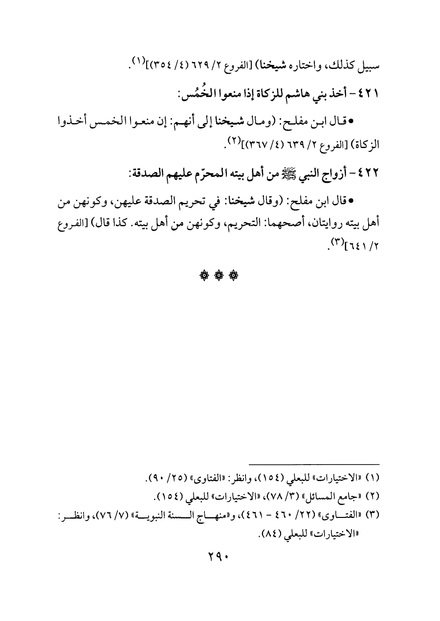 - قال ابن مفلح: (وقال شيخنا: في تحريم الصدقة عليهن، وكونهن من أهل بيته روايتان، أصحهما: التحريم، وكونهن من أهل بيته. كذا قال) [الفروع ٢/ ٦٤١] (¬٣).
