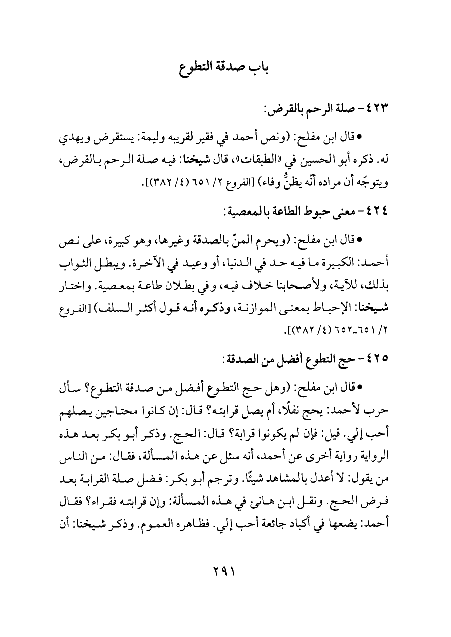 - قال ابن مفلح: (وهل حج التطوع أفضل من صدقة التطوع؟ سأل حرب لأحمد: يحج نفلًا، أم يصل قرابته؟ قال: إن كانوا محتاجين يصلهم أحب إلي. قيل: فإن لم يكونوا قرابة؟ قال: الحج. وذكر أبو بكر بعد هذه الرواية رواية أخرى عن أحمد، أنه سئل عن هذه المسألة، فقال: من الناس من يقول: لا أعدل بالمشاهد شيئًا. وترجم أبو بكر: فضل صلة القرابة بعد فرض الحج. ونقل ابن هانئ في هذه المسألة: وإن قرابته فقراء؟ فقال أحمد: يضعها في أكباد جائعة أحب إلي. فظاهره العموم. وذكر شيخنا: أن