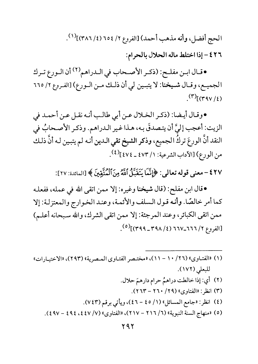 - قال ابن مفلح: (ذكر الأصحاب في الدراهم (¬٢) أن الورع ترك الجميع، وقال شيخنا: لا يتبين لي أن ذلك من الورع) [الفروع ٢/ ٦٦٥ (٤/ ٣٩٧)] (¬٣).