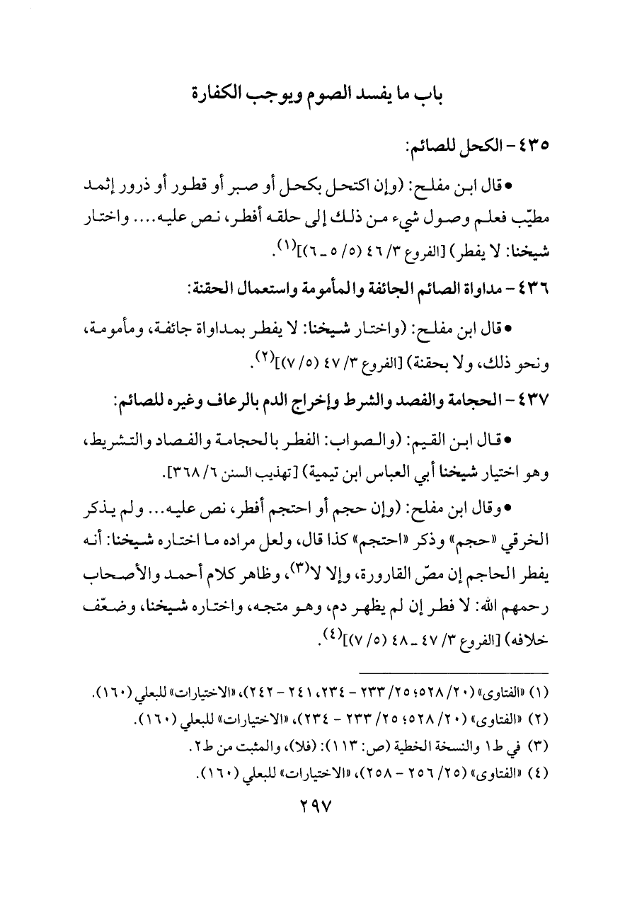 - قال ابن مفلح: (واختار شيخنا: لا يفطر بمداواة جائفة، ومأمومة، ونحو ذلك، ولا بحقنة) [الفروع ٣/ ٤٧ (٥/ ٧)] (¬٢).