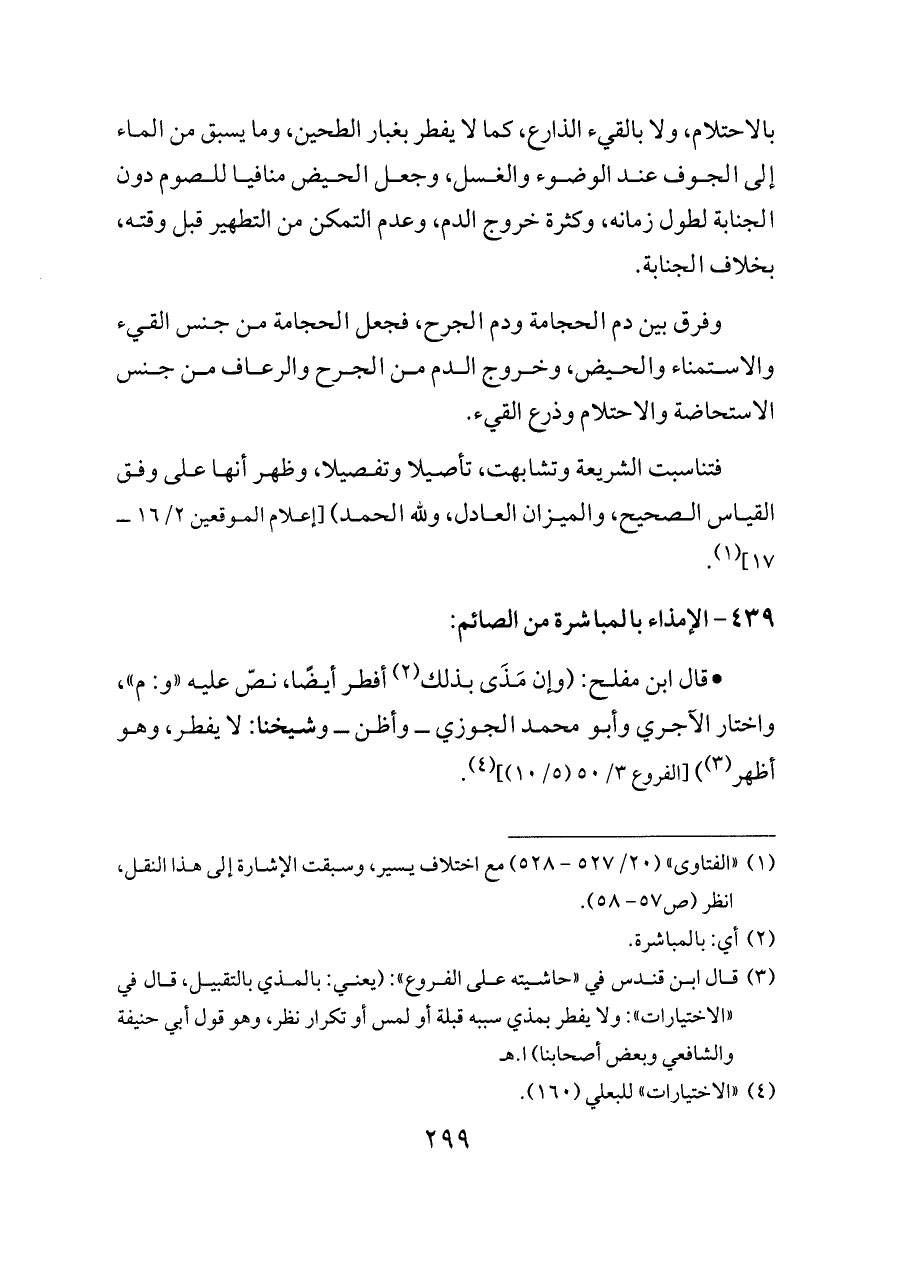 (¬٣) قال ابن قندس في «حاشيته على الفروع»: (يعني: بالمذي بالتقبيل، قال في «الاختيارات»: ولا يفطر بمذي سببه قبلة أو لمس أو تكرار نظر، وهو قول أبي حنيفة والشافعي وبعض أصحابنا) ا. هـ