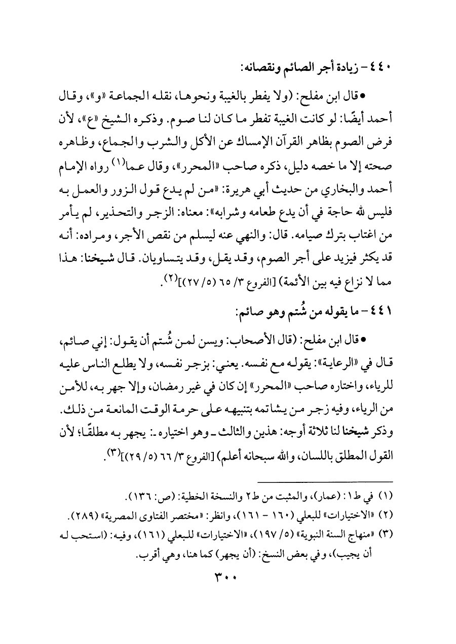 - قال ابن مفلح: (ولا يفطر بالغيبة ونحوها، نقله الجماعة «و»، وقال أحمد أيضًا: لو كانت الغيبة تفطر ما كان لنا صوم. وذكره الشيخ «ع»، لأن فرض الصوم بظاهر القرآن الإمساك عن الأكل والشرب والجماع، وظاهره صحته إلا ما خصه دليل، ذكره صاحب «المحرر»، وقال عما (¬١) رواه الإمام أحمد والبخاري من حديث أبي هريرة: «من لم يدع قول الزور والعمل به فليس لله حاجة في أن يدع طعامه وشرابه»: معناه: الزجر والتحذير، لم يأمر من اغتاب بترك صيامه. قال: والنهي عنه ليسلم من نقص الأجر، ومراده: أنه قد يكثر فيزيد على أجر الصوم، وقد يقل، وقد يتساويان. قال شيخنا: هذا مما لا نزاع فيه بين الأئمة) [الفروع ٣/ ٦٥ (٥/ ٢٧)] (¬٢).