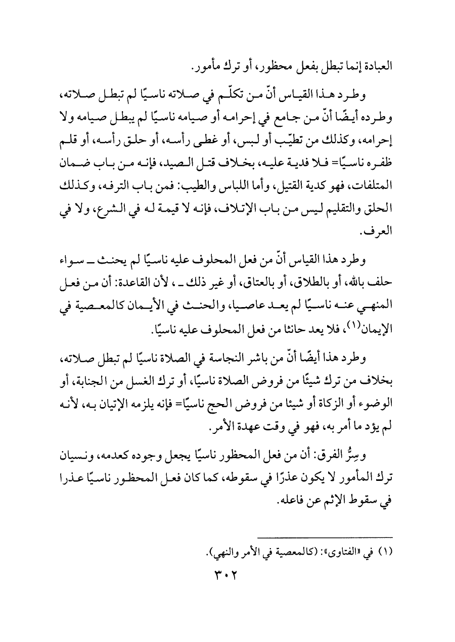 وطرد هذا أيضًا أنّ من باشر النجاسة في الصلاة ناسيًا لم تبطل صلاته، بخلاف من ترك شيئًا من فروض الصلاة ناسيًا، أو ترك الغسل من الجنابة، أو الوضوء أو الزكاة أو شيئا من فروض الحج ناسيًا= فإنه يلزمه الإتيان به، لأنه لم يؤد ما أمر به، فهو في وقت عهدة الأمر.