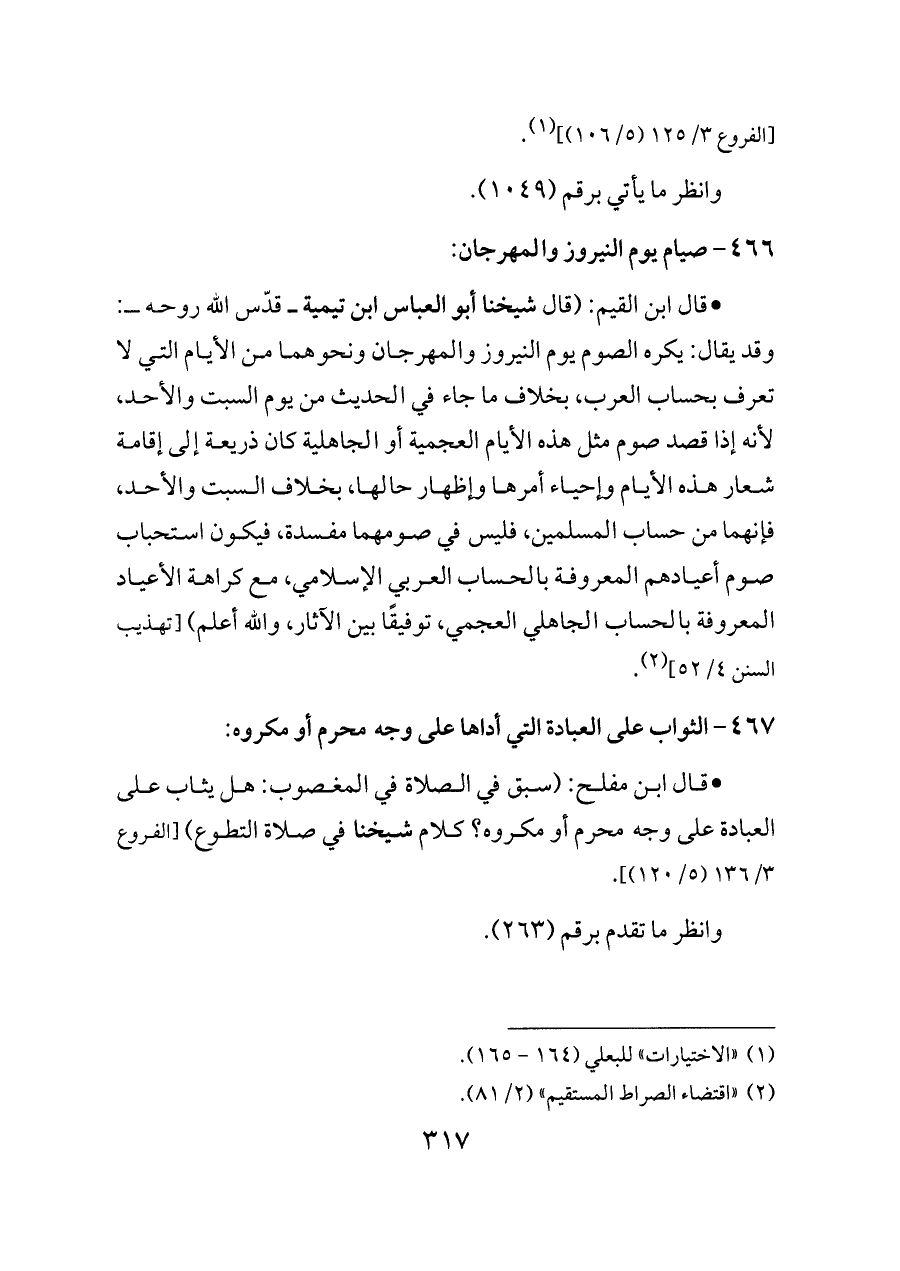 - قال ابن القيم: (قال شيخنا أبو العباس ابن تيمية ــ قدّس الله روحه ــ: وقد يقال: يكره الصوم يوم النيروز والمهرجان ونحوهما من الأيام التي لا تعرف بحساب العرب، بخلاف ما جاء في الحديث من يوم السبت والأحد، لأنه إذا قصد صوم مثل هذه الأيام العجمية أو الجاهلية كان ذريعة إلى إقامة شعار هذه الأيام وإحياء أمرها وإظهار حالها، بخلاف السبت والأحد، فإنهما من حساب المسلمين، فليس في صومهما مفسدة، فيكون استحباب صوم أعيادهم المعروفة بالحساب العربي الإسلامي، مع كراهة الأعياد المعروفة بالحساب الجاهلي العجمي، توفيقًا بين الآثار، والله أعلم) [تهذيب السنن ٤/ ٥٢] (¬٢).