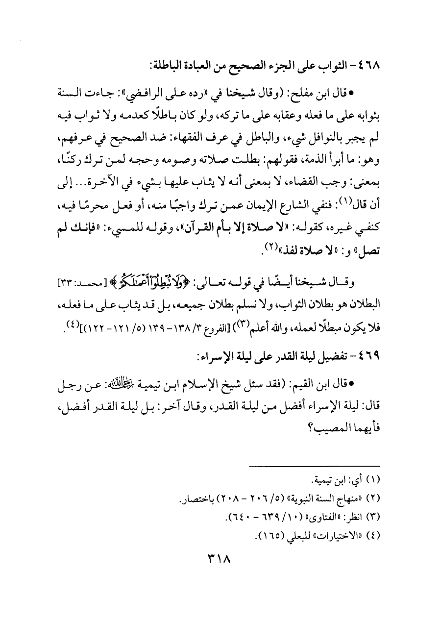 - قال ابن مفلح: (وقال شيخنا في «رده على الرافضي»: جاءت السنة بثوابه على ما فعله وعقابه على ما تركه، ولو كان باطلًا كعدمه ولا ثواب فيه لم يجبر بالنوافل شيء، والباطل في عرف الفقهاء: ضد الصحيح في عرفهم، وهو: ما أبرأ الذمة، فقولهم: بطلت صلاته وصومه وحجه لمن ترك ركنًا، بمعنى: وجب القضاء، لا بمعنى أنه لا يثاب عليها بشيء في الآخرة ... إلى أن قال (¬١): فنفي الشارع الإيمان عمن ترك واجبًا منه، أو فعل محرمًا فيه، كنفي غيره، كقوله: «لا صلاة إلا بأم القرآن»، وقوله للمسيء: «فإنك لم تصل» و: «لا صلاة لفذ» (¬٢).