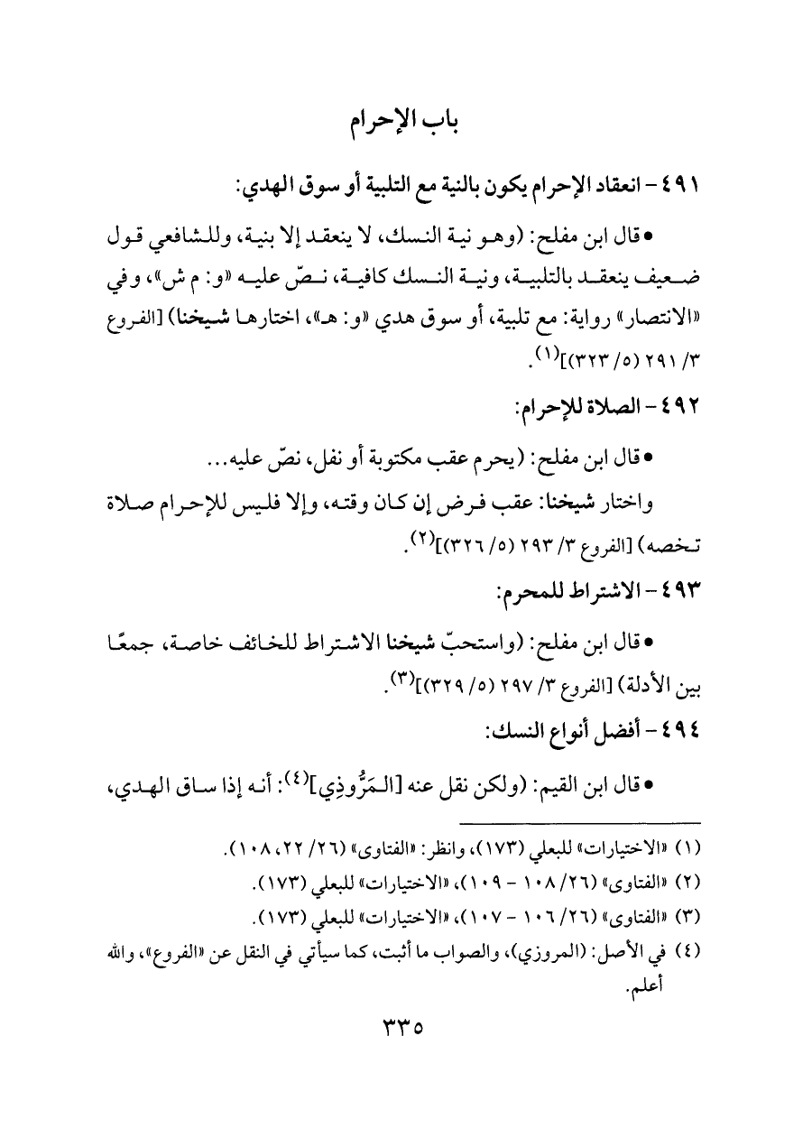 - قال ابن مفلح: (وهو نية النسك، لا ينعقد إلا بنية، وللشافعي قول ضعيف ينعقد بالتلبية، ونية النسك كافية، نصّ عليه «و: م ش»، وفي «الانتصار» رواية: مع تلبية، أو سوق هدي «و: هـ»، اختارها شيخنا) [الفروع ٣/ ٢٩١ (٥/ ٣٢٣)] (¬١).