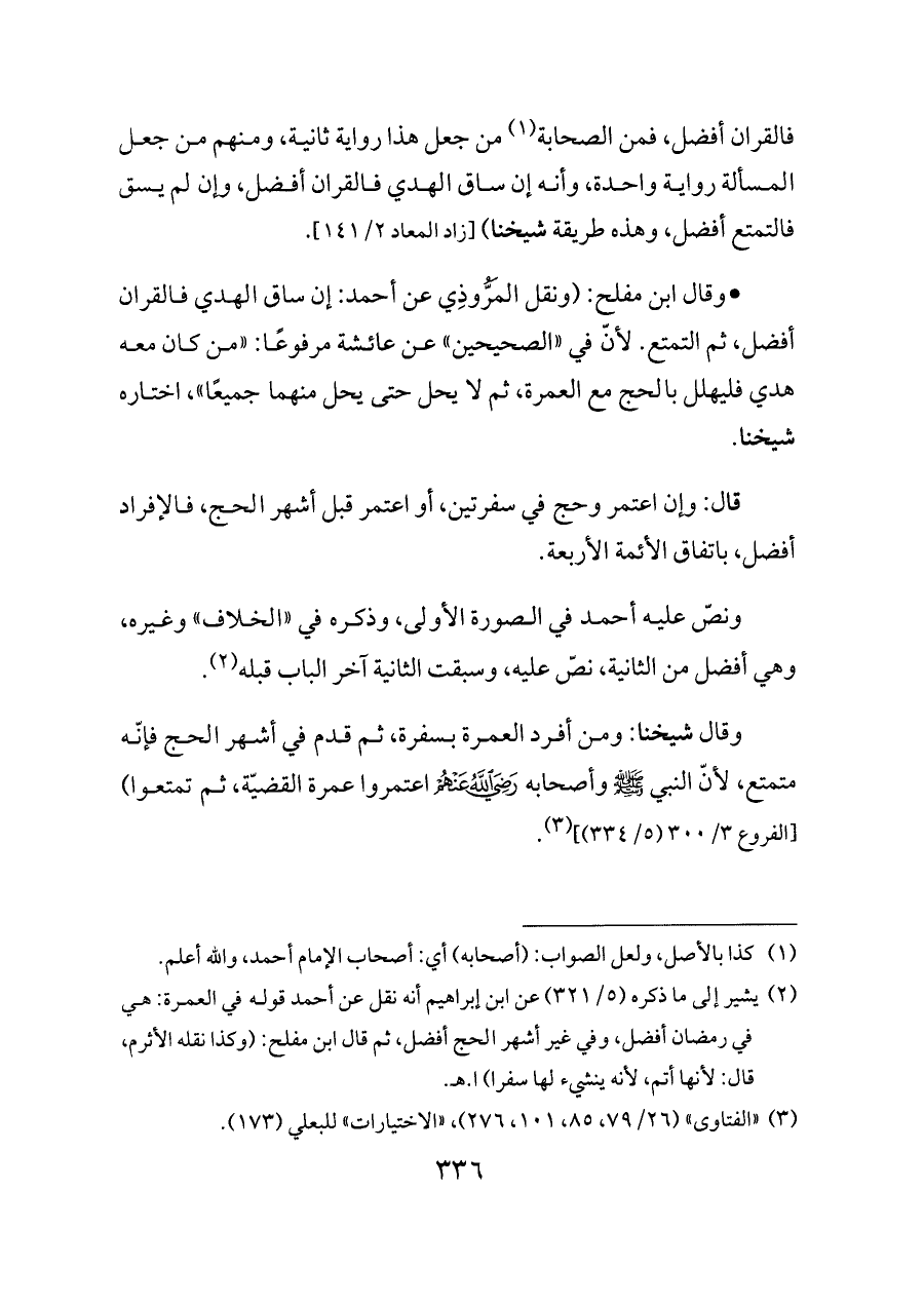 (¬٢) يشير إلى ما ذكره (٥/ ٣٢١) عن ابن إبراهيم أنه نقل عن أحمد قوله في العمرة: هي في رمضان أفضل، وفي غير أشهر الحج أفضل، ثم قال ابن مفلح: (وكذا نقله الأثرم، قال: لأنها أتم، لأنه ينشيء لها سفرا) ا. هـ.