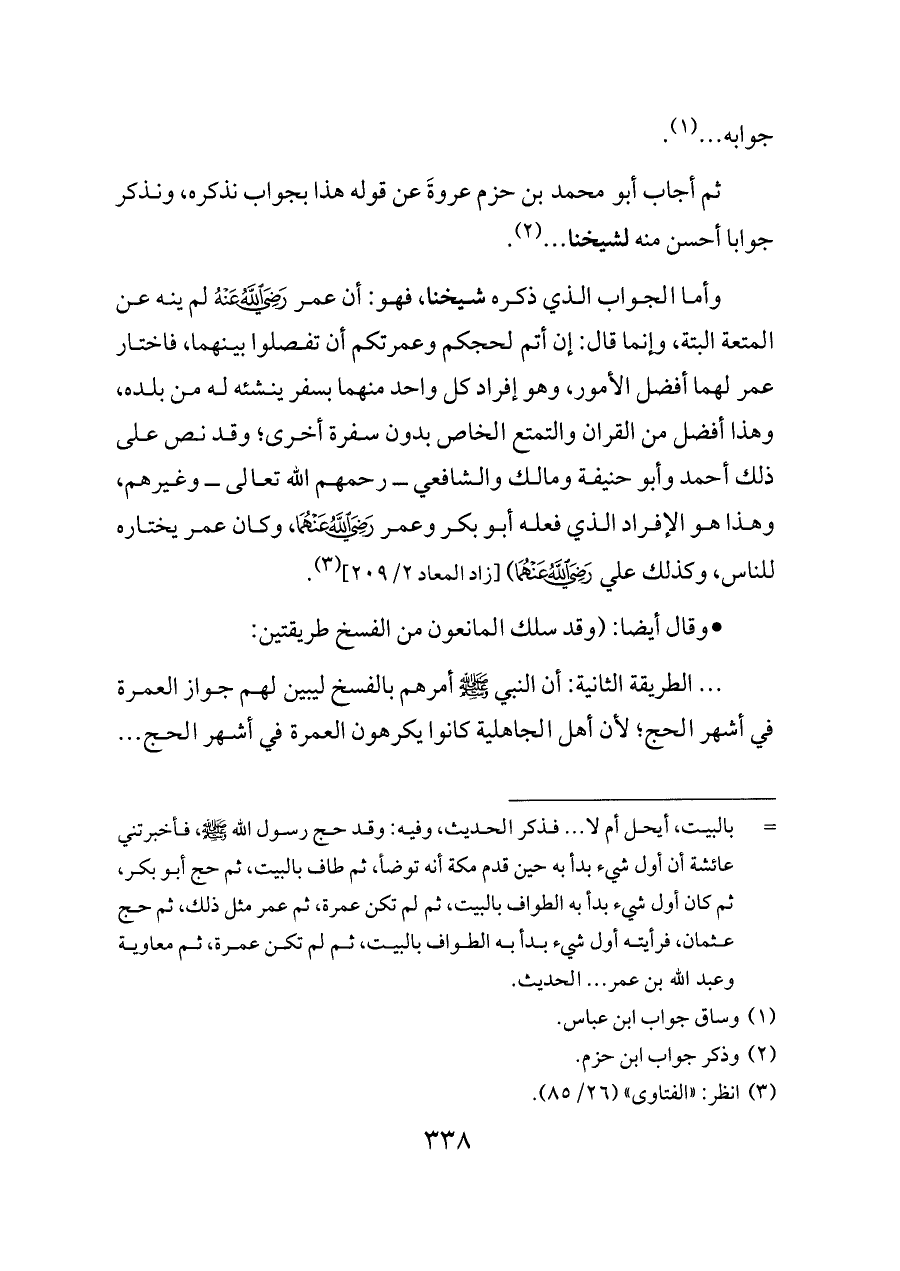 وأما الجواب الذي ذكره شيخنا، فهو: أن عمر - رضي الله عنه - لم ينه عن المتعة البتة، وإنما قال: إن أتم لحجكم وعمرتكم أن تفصلوا بينهما، فاختار عمر لهما أفضل الأمور، وهو إفراد كل واحد منهما بسفر ينشئه له من بلده، وهذا أفضل من القران والتمتع الخاص بدون سفرة أخرى؛ وقد نص على ذلك أحمد وأبو حنيفة ومالك والشافعي ــ رحمهم الله تعالى ــ وغيرهم، وهذا هو الإفراد الذي فعله أبو بكر وعمر - رضي الله عنهما -، وكان عمر يختاره للناس، وكذلك علي - رضي الله عنهما -) [زاد المعاد ٢/ ٢٠٩] (¬٣).