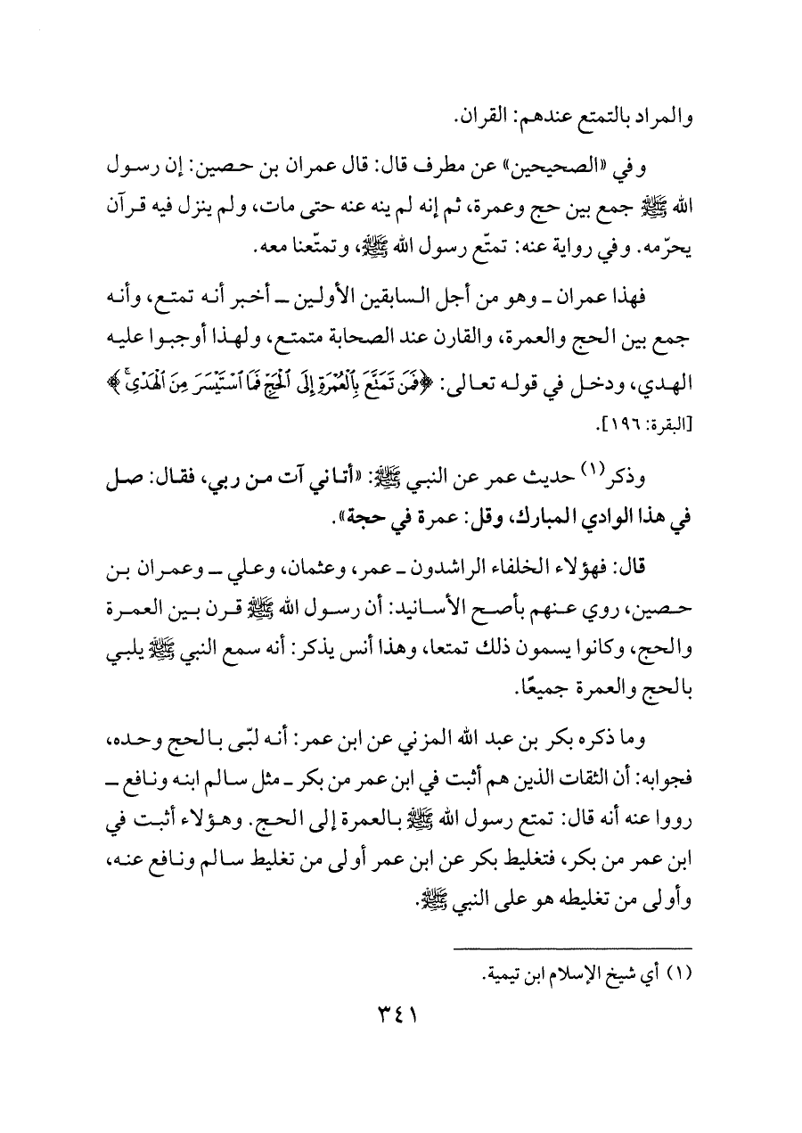 فهذا عمران ــ وهو من أجل السابقين الأولين ــ أخبر أنه تمتع، وأنه جمع بين الحج والعمرة، والقارن عند الصحابة متمتع، ولهذا أوجبوا عليه الهدي، ودخل في قوله تعالى: {فَمَنْ تَمَتَّعَ بِالْعُمْرَةِ إِلَى الْحَجِّ فَمَا اسْتَيْسَرَ مِنَ الْهَدْيِ} [البقرة: ١٩٦].