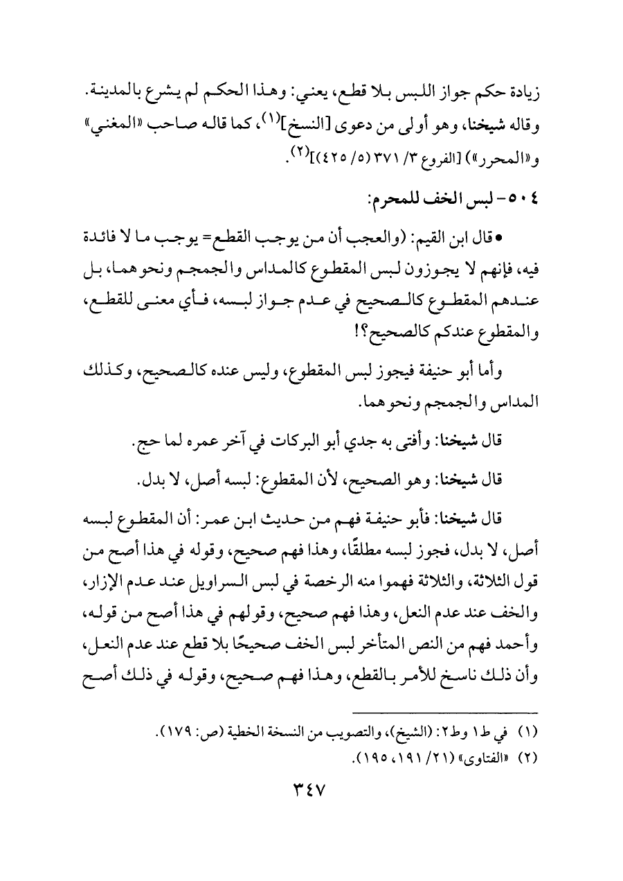 - قال ابن القيم: (والعجب أن من يوجب القطع= يوجب ما لا فائدة فيه، فإنهم لا يجوزون لبس المقطوع كالمداس والجمجم ونحوهما، بل عندهم المقطوع كالصحيح في عدم جواز لبسه، فأي معنى للقطع، والمقطوع عندكم كالصحيح؟!