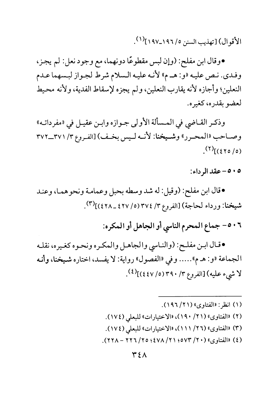 - قال ابن مفلح: (وقيل: له شد وسطه بحبل وعمامة ونحوهما، وعند شيخنا: ورداء لحاجة) [الفروع ٣/ ٣٧٤ (٥/ ٤٢٧ ــ ٤٢٨)] (¬٣).