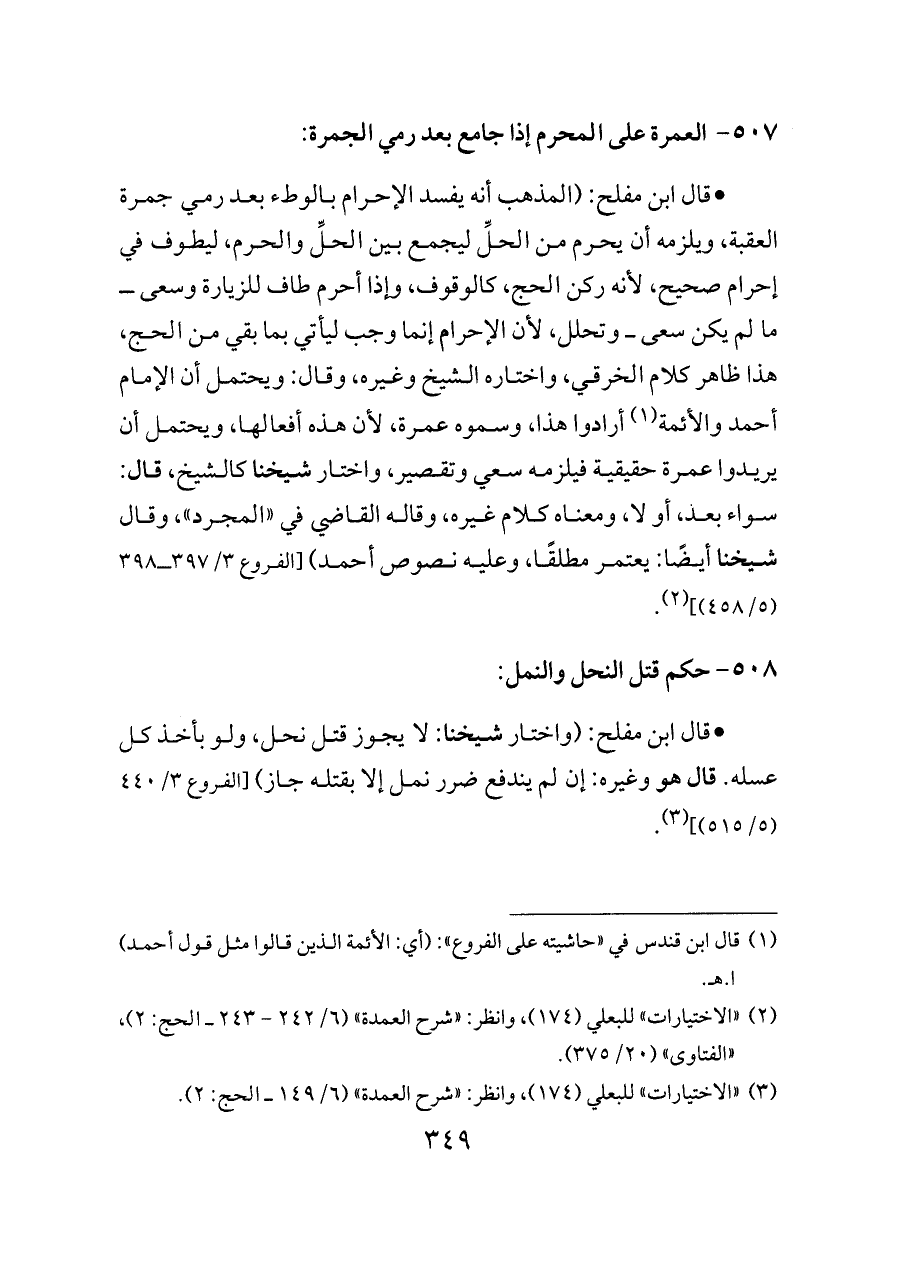 - قال ابن مفلح: (واختار شيخنا: لا يجوز قتل نحل، ولو بأخذ كل عسله. قال هو وغيره: إن لم يندفع ضرر نمل إلا بقتله جاز) [الفروع ٣/ ٤٤٠ (٥/ ٥١٥)] (¬٣).
