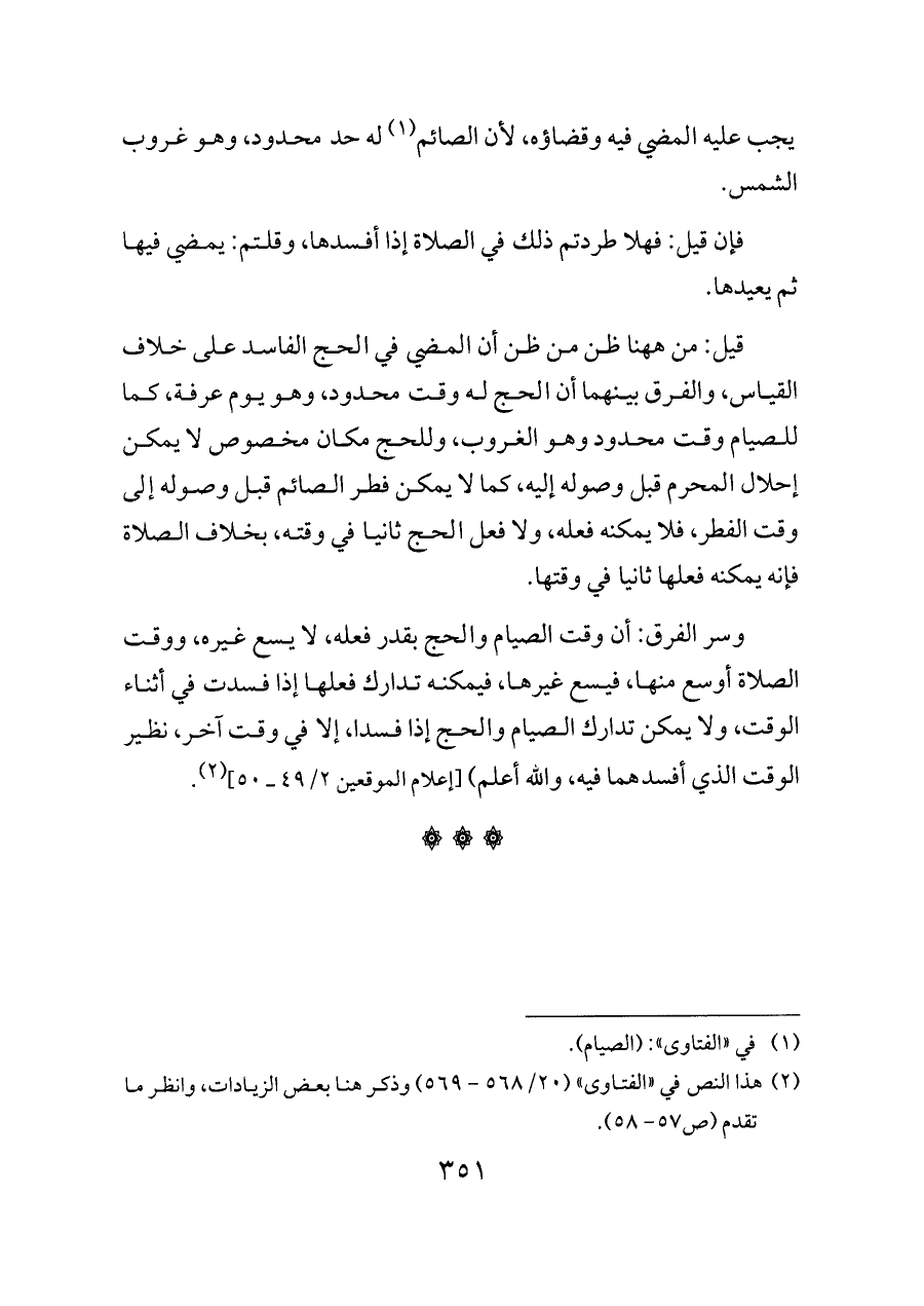 وسر الفرق: أن وقت الصيام والحج بقدر فعله، لا يسع غيره، ووقت الصلاة أوسع منها، فيسع غيرها، فيمكنه تدارك فعلها إذا فسدت في أثناء الوقت، ولا يمكن تدارك الصيام والحج إذا فسدا، إلا في وقت آخر، نظير الوقت الذي أفسدهما فيه، والله أعلم) [إعلام الموقعين ٢/ ٤٩ ــ ٥٠] (¬٢).