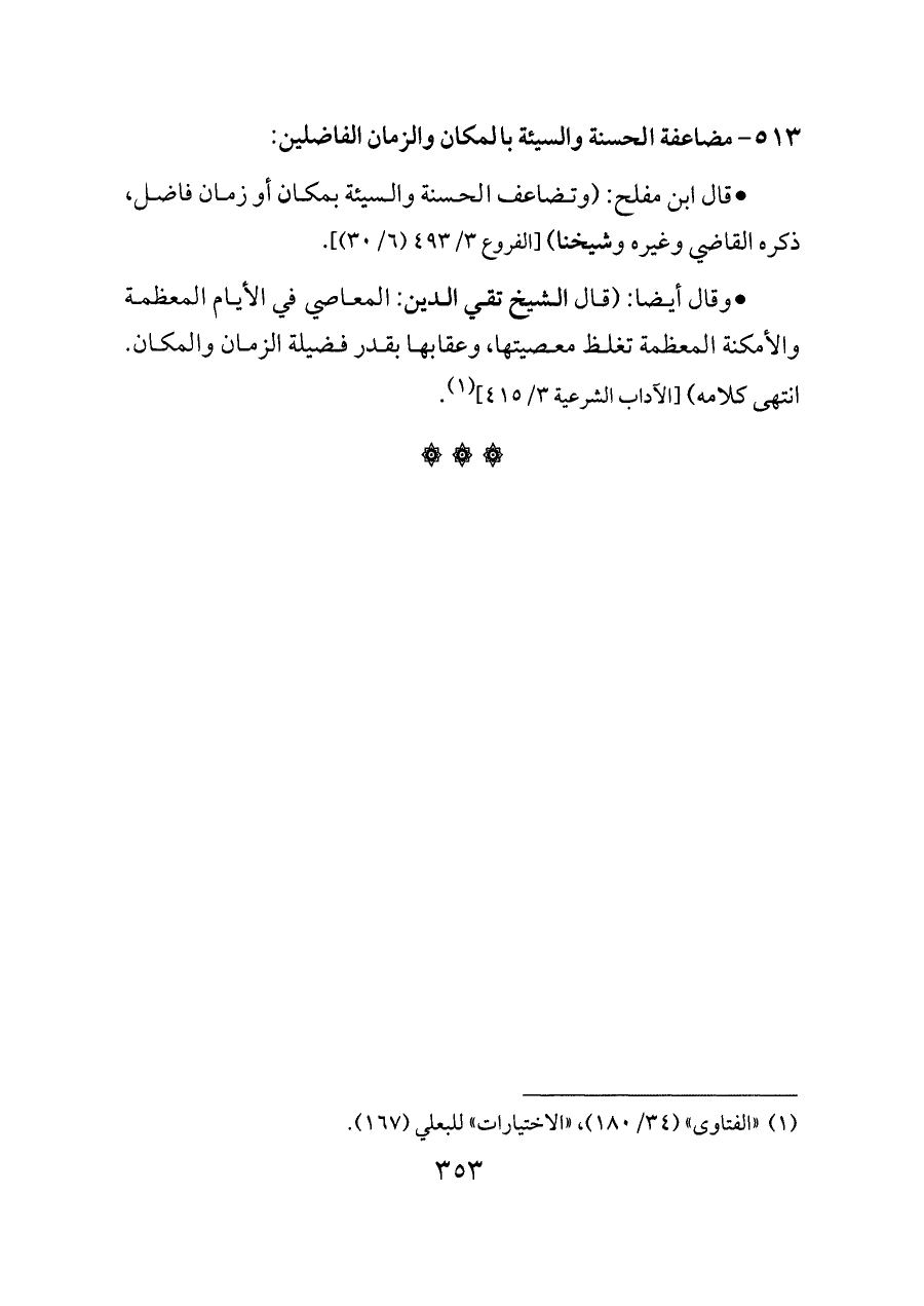 - قال ابن مفلح: (وتضاعف الحسنة والسيئة بمكان أو زمان فاضل، ذكره القاضي وغيره وشيخنا) [الفروع ٣/ ٤٩٣ (٦/ ٣٠)].