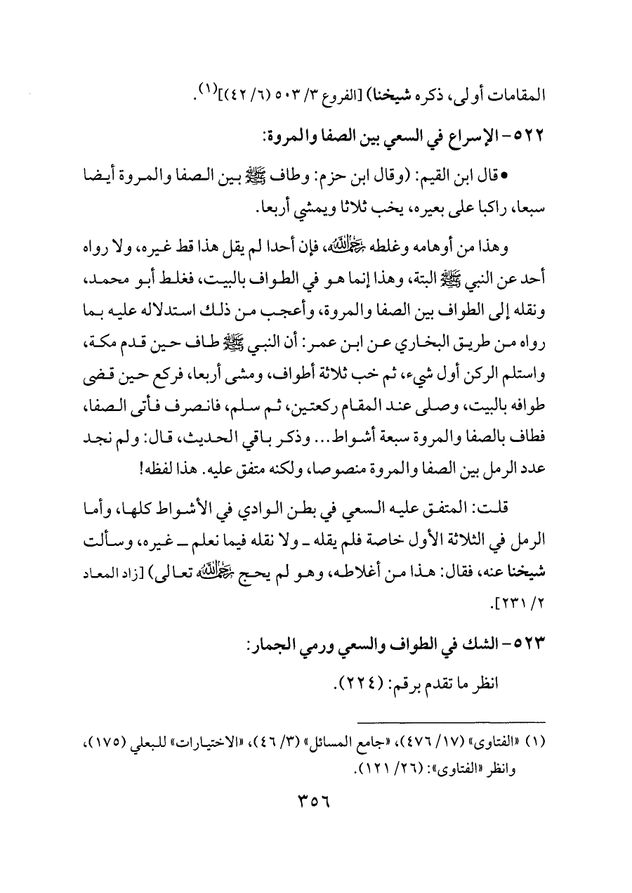 - قال ابن القيم: (وقال ابن حزم: وطاف - صلى الله عليه وسلم - بين الصفا والمروة أيضا سبعا، راكبا على بعيره، يخب ثلاثا ويمشي أربعا.