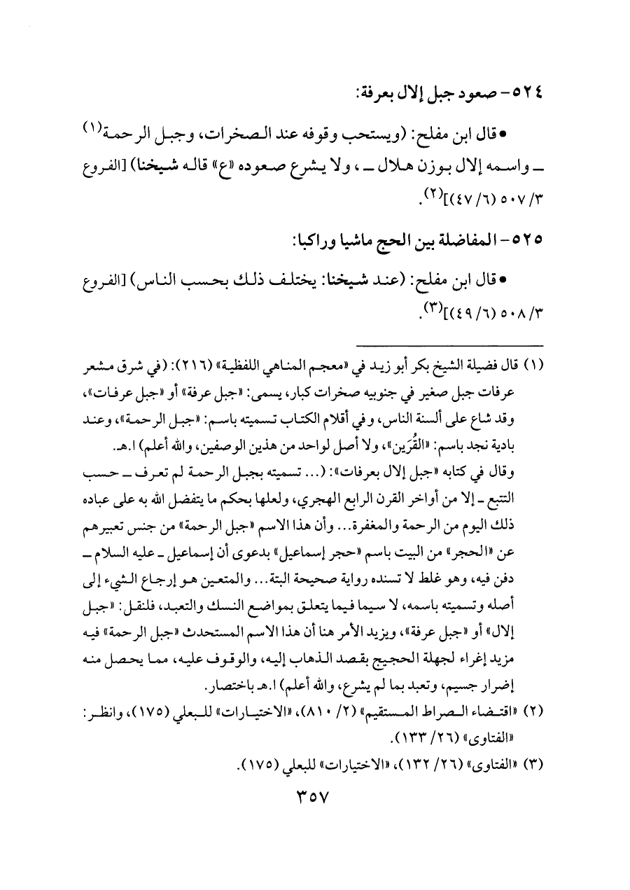 (¬١) قال فضيلة الشيخ بكر أبو زيد في «معجم المناهي اللفظية» (٢١٦): (في شرق مشعر عرفات جبل صغير في جنوبيه صخرات كبار، يسمى: «جبل عرفة» أو «جبل عرفات»، وقد شاع على ألسنة الناس، وفي أقلام الكتاب تسميته باسم: «جبل الرحمة»، وعند بادية نجد باسم: «القُرَين»، ولا أصل لواحد من هذين الوصفين، والله أعلم) ا. هـ.