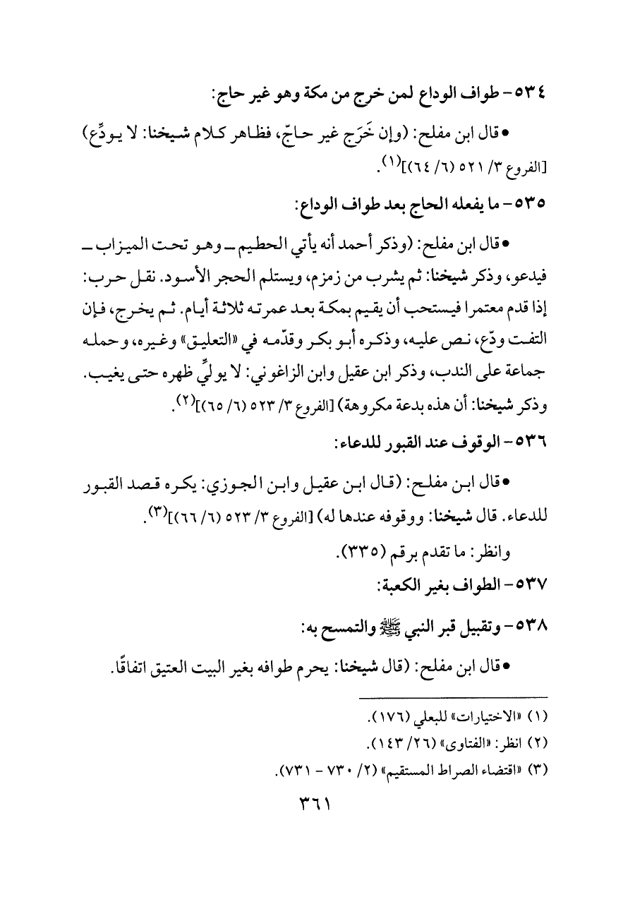 - قال ابن مفلح: (وإن خَرَج غير حاجّ، فظاهر كلام شيخنا: لا يودِّع) [الفروع ٣/ ٥٢١ (٦/ ٦٤)] (¬١).