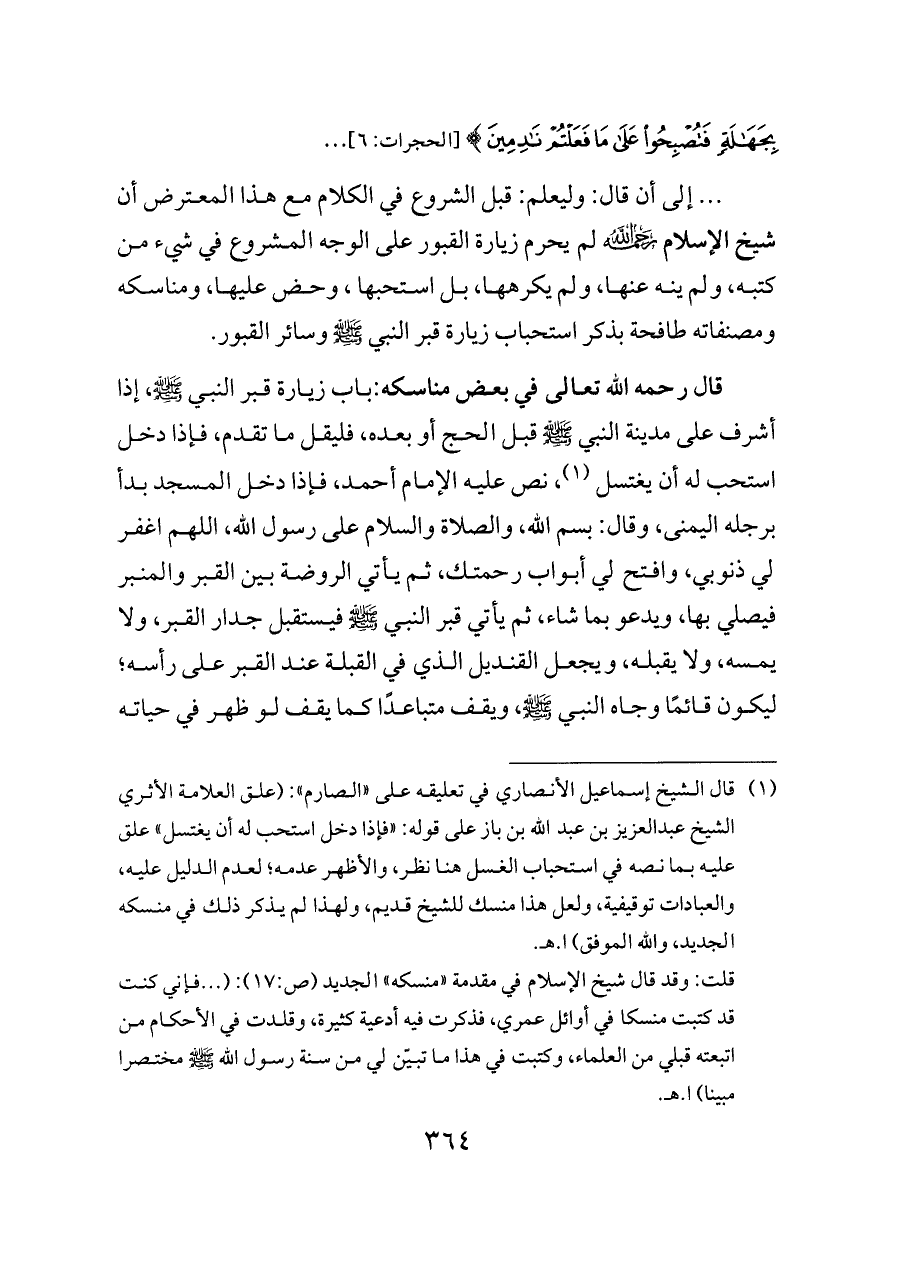 إلى أن قال: وليعلم: قبل الشروع في الكلام مع هذا المعترض أن شيخ الإسلام - رحمه الله - لم يحرم زيارة القبور على الوجه المشروع في شيء من كتبه، ولم ينه عنها، ولم يكرهها، بل استحبها، وحض عليها، ومناسكه ومصنفاته طافحة بذكر استحباب زيارة قبر النبي - صلى الله عليه وسلم - وسائر القبور.