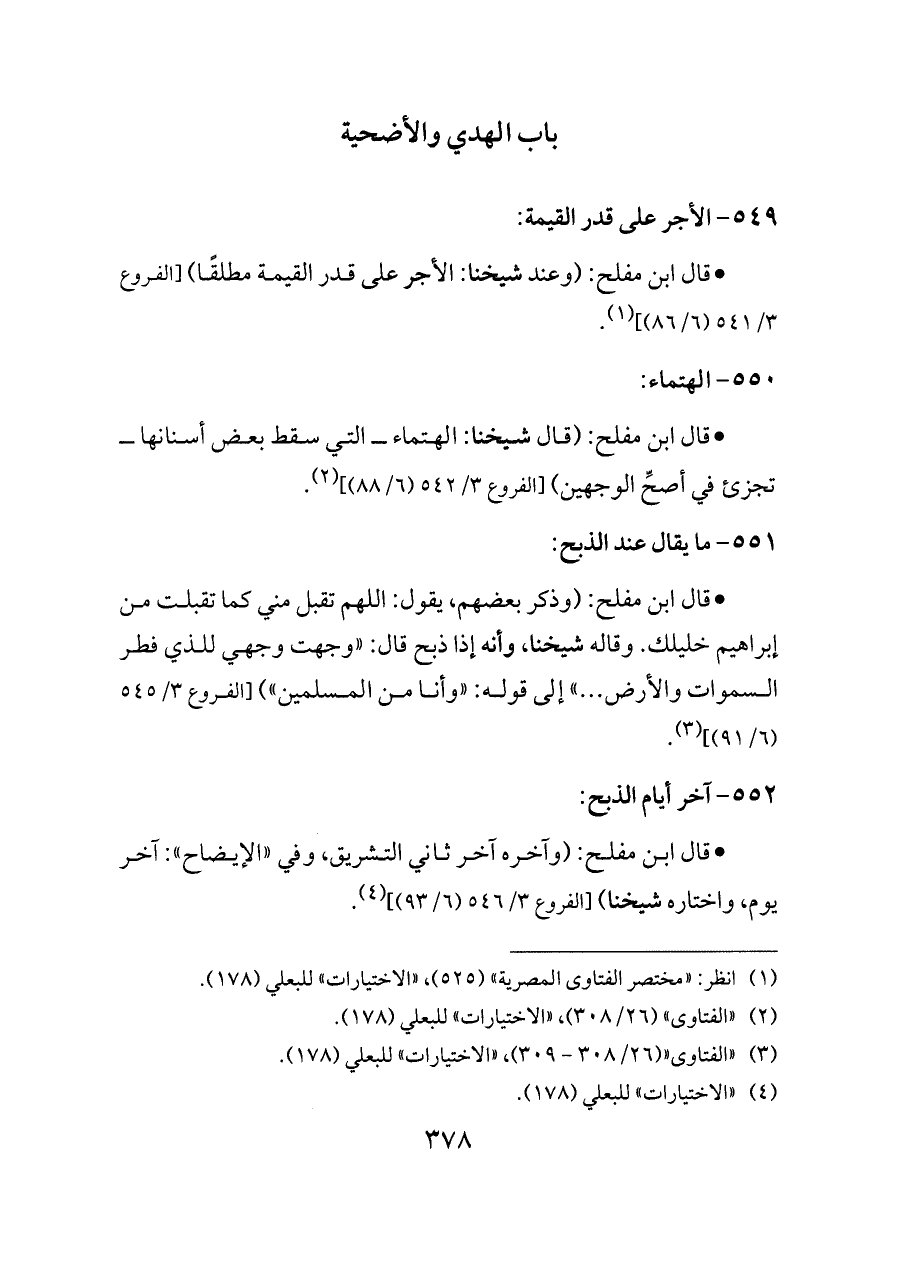 - قال ابن مفلح: (وذكر بعضهم، يقول: اللهم تقبل مني كما تقبلت من إبراهيم خليلك. وقاله شيخنا، وأنه إذا ذبح قال: «وجهت وجهي للذي فطر السموات والأرض ... » إلى قوله: «وأنا من المسلمين») [الفروع ٣/ ٥٤٥ (٦/ ٩١)] (¬٣).