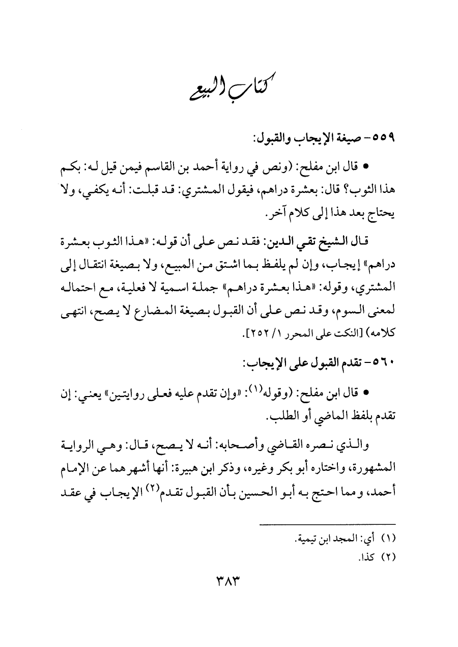 - قال ابن مفلح: (ونص في رواية أحمد بن القاسم فيمن قيل له: بكم هذا الثوب؟ قال: بعشرة دراهم، فيقول المشتري: قد قبلت: أنه يكفي، ولا يحتاج بعد هذا إلى كلام آخر.