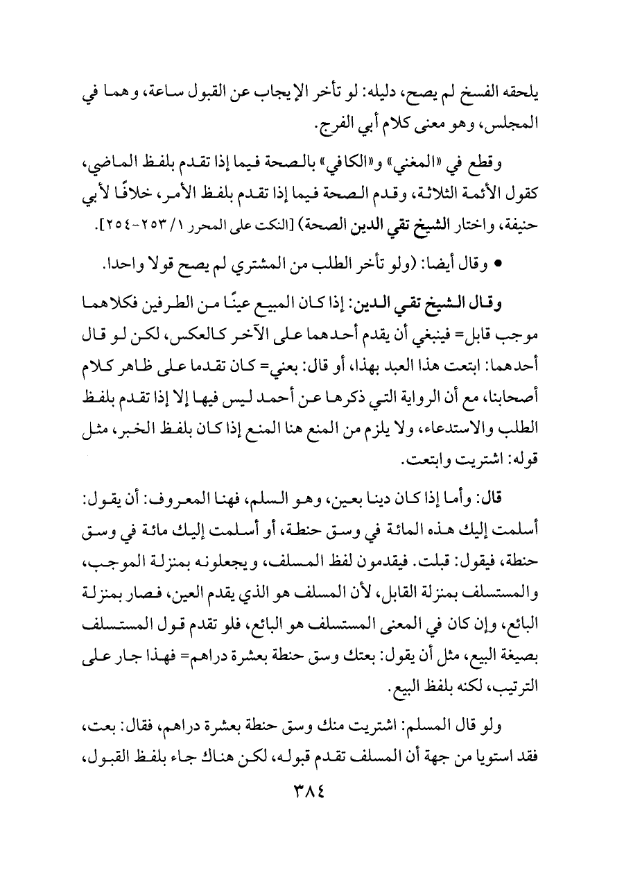 قال: وأما إذا كان دينا بعين، وهو السلم، فهنا المعروف: أن يقول: أسلمت إليك هذه المائة في وسق حنطة، أو أسلمت إليك مائة في وسق حنطة، فيقول: قبلت. فيقدمون لفظ المسلف، ويجعلونه بمنزلة الموجب، والمستسلف بمنزلة القابل، لأن المسلف هو الذي يقدم العين، فصار بمنزلة البائع، وإن كان في المعنى المستسلف هو البائع، فلو تقدم قول المستسلف بصيغة البيع، مثل أن يقول: بعتك وسق حنطة بعشرة دراهم= فهذا جار على الترتيب، لكنه بلفظ البيع.