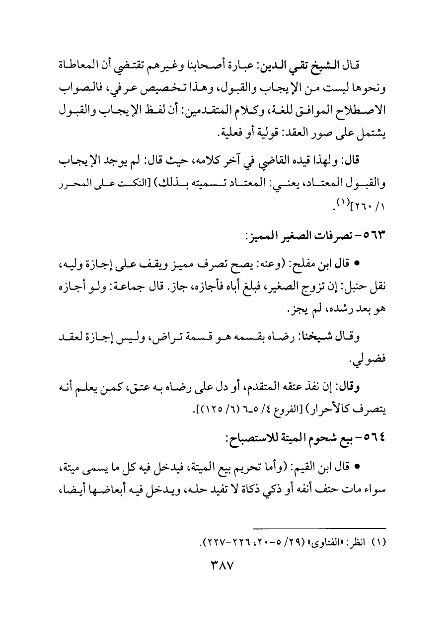 قال الشيخ تقي الدين: عبارة أصحابنا وغيرهم تقتضي أن المعاطاة ونحوها ليست من الإيجاب والقبول، وهذا تخصيص عرفي، فالصواب الاصطلاح الموافق للغة، وكلام المتقدمين: أن لفظ الإيجاب والقبول يشتمل على صور العقد: قولية أو فعلية.