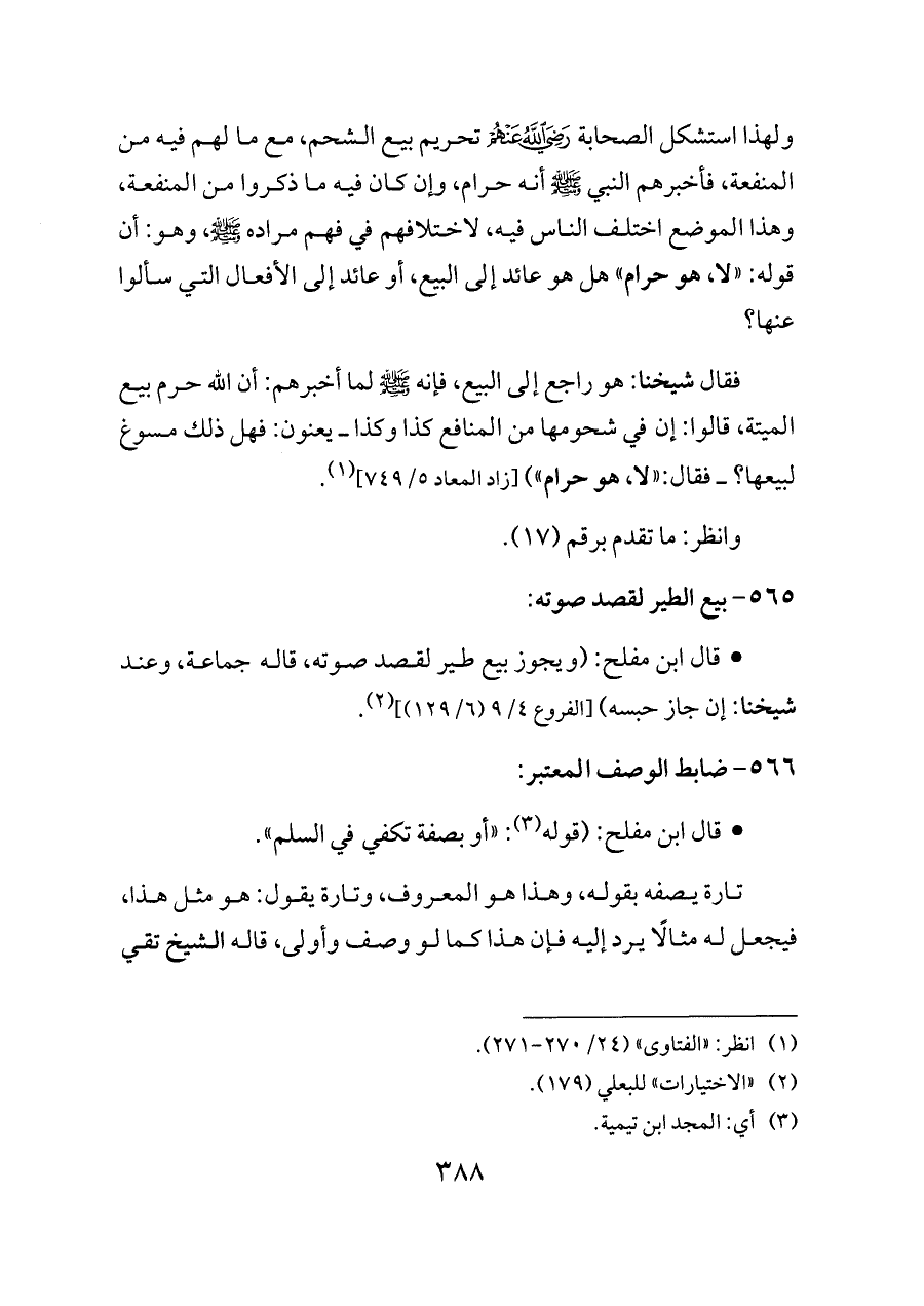 فقال شيخنا: هو راجع إلى البيع، فإنه - صلى الله عليه وسلم - لما أخبرهم: أن الله حرم بيع الميتة، قالوا: إن في شحومها من المنافع كذا وكذا ــ يعنون: فهل ذلك مسوغ لبيعها؟ ــ فقال: «لا، هو حرام») [زاد المعاد ٥/ ٧٤٩] (¬١).