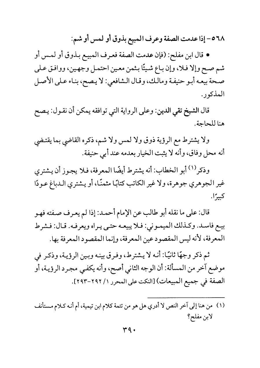 - قال ابن مفلح: (فإن عدمت الصفة فعرف المبيع بذوق أو لمس أو شم صح وإلا فلا، وإن باع شيئًا بثمن معين احتمل وجهين، ووافق على صحة بيعه أبو حنيفة ومالك، وقال الشافعي: لا يصح، بناء على الأصل المذكور.
