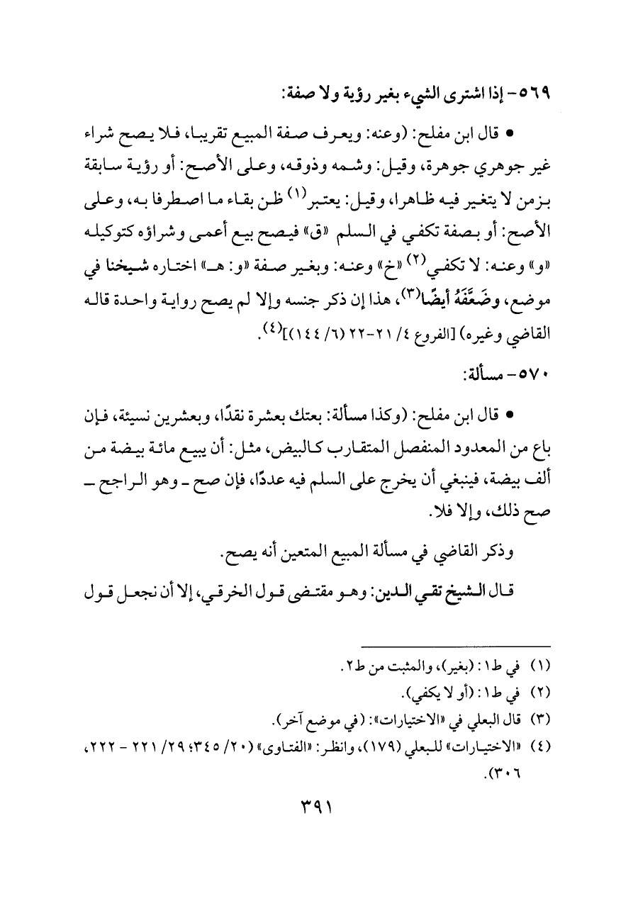 - قال ابن مفلح: (وكذا مسألة: بعتك بعشرة نقدًا، وبعشرين نسيئة، فإن باع من المعدود المنفصل المتقارب كالبيض، مثل: أن يبيع مائة بيضة من ألف بيضة، فينبغي أن يخرج على السلم فيه عددًا، فإن صح ــ وهو الراجح ــ صح ذلك، وإلا فلا.