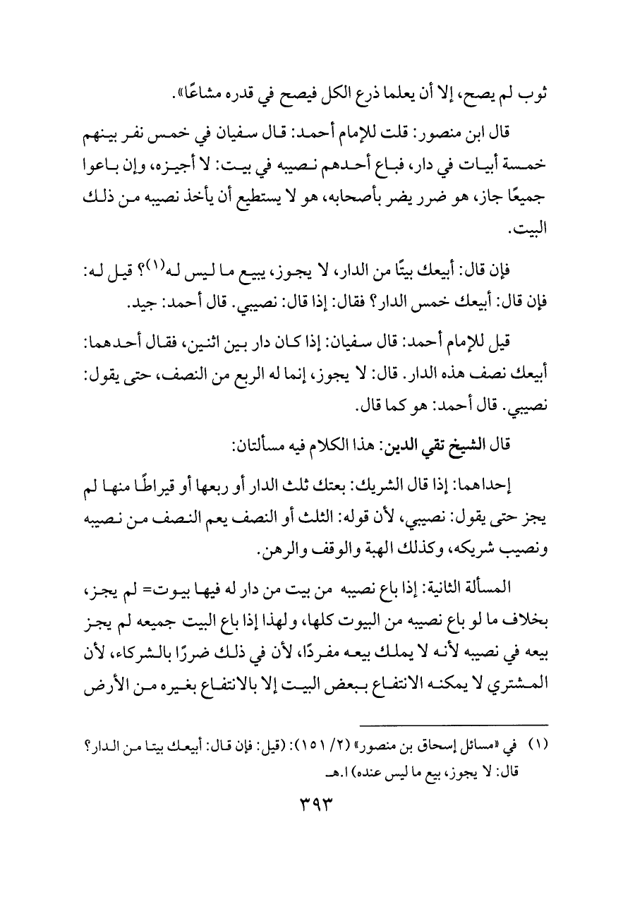 قيل للإمام أحمد: قال سفيان: إذا كان دار بين اثنين، فقال أحدهما: أبيعك نصف هذه الدار. قال: لا يجوز، إنما له الربع من النصف، حتى يقول: نصيبي. قال أحمد: هو كما قال.
