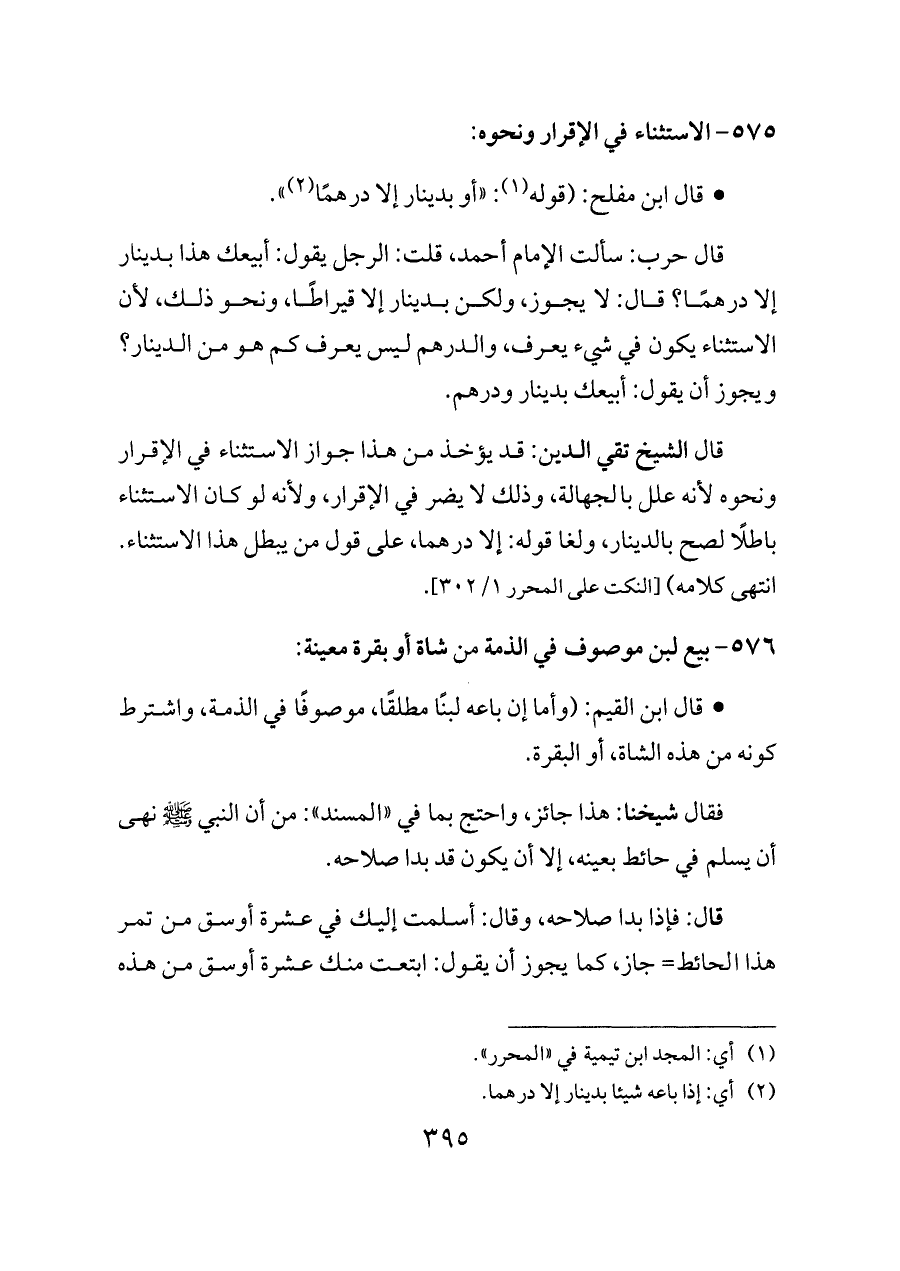 قال حرب: سألت الإمام أحمد، قلت: الرجل يقول: أبيعك هذا بدينار إلا درهمًا؟ قال: لا يجوز، ولكن بدينار إلا قيراطًا، ونحو ذلك، لأن الاستثناء يكون في شيء يعرف، والدرهم ليس يعرف كم هو من الدينار؟ ويجوز أن يقول: أبيعك بدينار ودرهم.