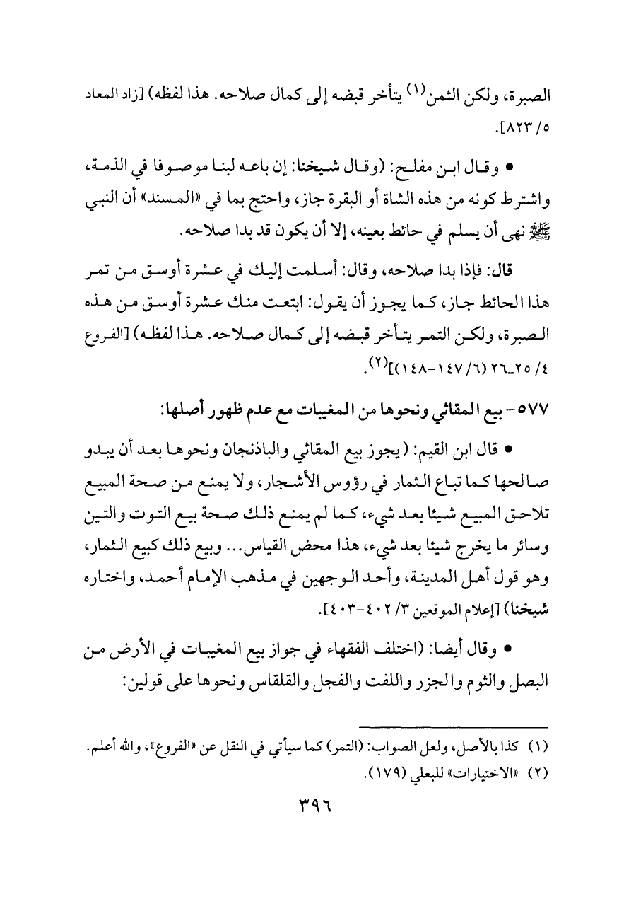 - وقال ابن مفلح: (وقال شيخنا: إن باعه لبنا موصوفا في الذمة، واشترط كونه من هذه الشاة أو البقرة جاز، واحتج بما في «المسند» أن النبي - صلى الله عليه وسلم - نهى أن يسلم في حائط بعينه، إلا أن يكون قد بدا صلاحه.