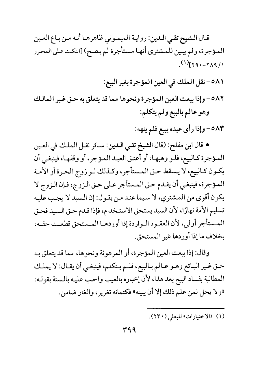 - قال ابن مفلح: (قال الشيخ تقي الدين: سائر نقل الملك في العين المؤجرة كالبيع، فلو وهبها، أو أعتق العبد المؤجر، أو وقفها، فينبغي أن يكون كالبيع، لا يسقط حق المستأجر، وكذلك لو زوج الحرة أو الأمة المؤجرة، فينبغي أن يقدم حق المستأجر على حق الزوج، فإن الزوج لا يكون أقوى من المشتري، لا سيما عند من يقول: إن السيد لا يجب عليه تسليم الأمة نهارًا، لأن السيد يستحق الاستخدام، فإذا قدم حق السيد فحق المستأجر أولى، لأن العقود الواردة إذا أوردها المستحق قطعت حقه، بخلاف ما إذا أوردها غير المستحق.