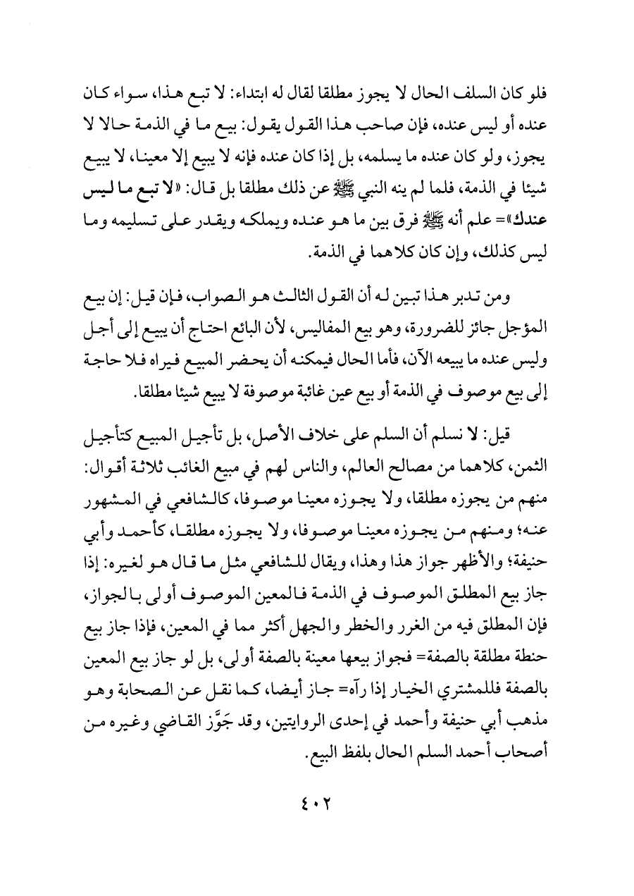 قيل: لا نسلم أن السلم على خلاف الأصل، بل تأجيل المبيع كتأجيل الثمن، كلاهما من مصالح العالم، والناس لهم في مبيع الغائب ثلاثة أقوال: منهم من يجوزه مطلقا، ولا يجوزه معينا موصوفا، كالشافعي في المشهور عنه؛ ومنهم من يجوزه معينا موصوفا، ولا يجوزه مطلقا، كأحمد وأبي حنيفة؛ والأظهر جواز هذا وهذا، ويقال للشافعي مثل ما قال هو لغيره: إذا جاز بيع المطلق الموصوف في الذمة فالمعين الموصوف أولى بالجواز، فإن المطلق فيه من الغرر والخطر والجهل أكثر مما في المعين، فإذا جاز بيع حنطة مطلقة بالصفة= فجواز بيعها معينة بالصفة أولى، بل لو جاز بيع المعين بالصفة فللمشتري الخيار إذا رآه= جاز أيضا، كما نقل عن الصحابة وهو مذهب أبي حنيفة وأحمد في إحدى الروايتين، وقد جَوَّز القاضي وغيره من أصحاب أحمد السلم الحال بلفظ البيع.