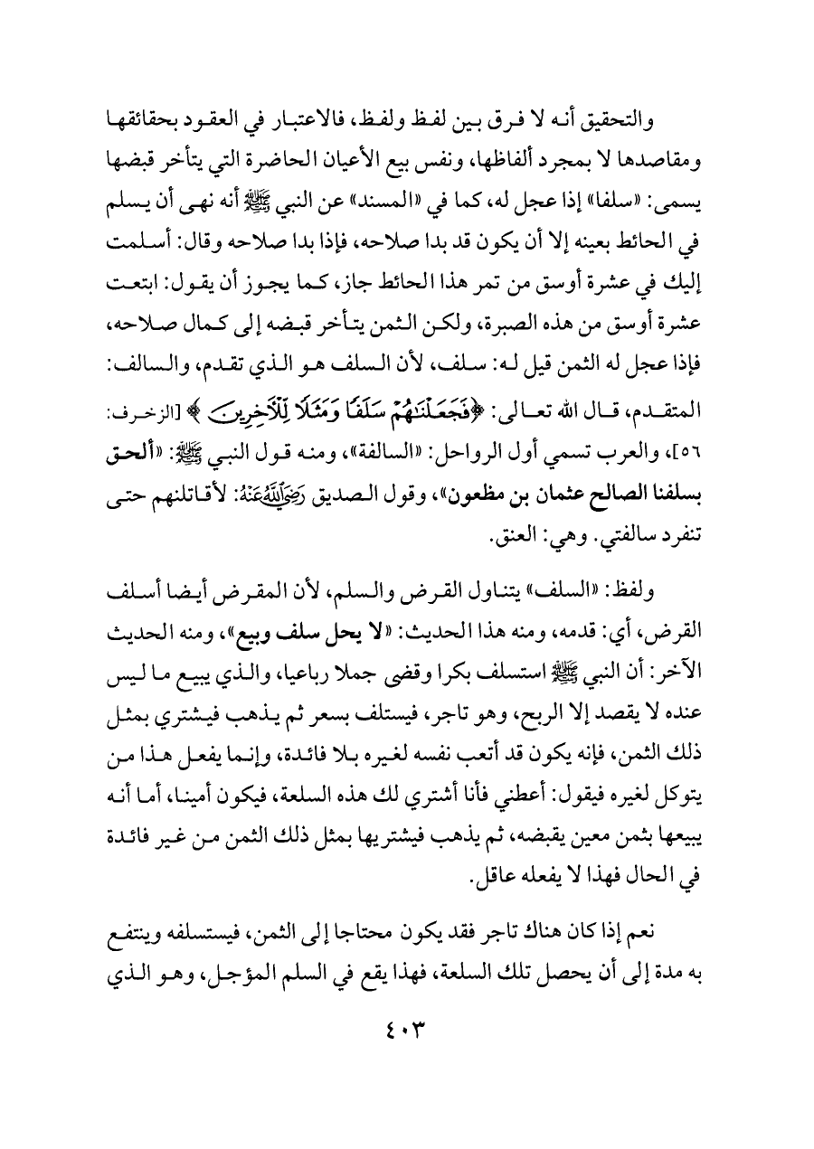 والتحقيق أنه لا فرق بين لفظ ولفظ، فالاعتبار في العقود بحقائقها ومقاصدها لا بمجرد ألفاظها، ونفس بيع الأعيان الحاضرة التي يتأخر قبضها يسمى: «سلفا» إذا عجل له، كما في «المسند» عن النبي - صلى الله عليه وسلم - أنه نهى أن يسلم في الحائط بعينه إلا أن يكون قد بدا صلاحه، فإذا بدا صلاحه وقال: أسلمت إليك في عشرة أوسق من تمر هذا الحائط جاز، كما يجوز أن يقول: ابتعت عشرة أوسق من هذه الصبرة، ولكن الثمن يتأخر قبضه إلى كمال صلاحه، فإذا عجل له الثمن قيل له: سلف، لأن السلف هو الذي تقدم، والسالف: المتقدم، قال الله تعالى: {فَجَعَلْنَاهُمْ سَلَفًا وَمَثَلًا لِلْآخِرِينَ} [الزخرف: ٥٦]، والعرب تسمي أول الرواحل: «السالفة»، ومنه قول النبي - صلى الله عليه وسلم - : «ألحق بسلفنا الصالح عثمان بن مظعون»، وقول الصديق - رضي الله عنه -: لأقاتلنهم حتى تنفرد سالفتي. وهي: العنق.