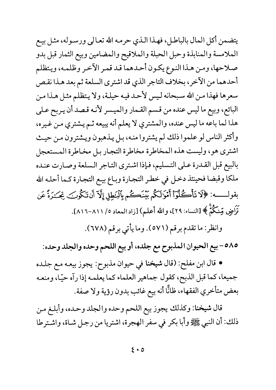 ٥٨٥ - بيع الحيوان المذبوح مع جلده، أو بيع اللحم وحده والجلد وحده: