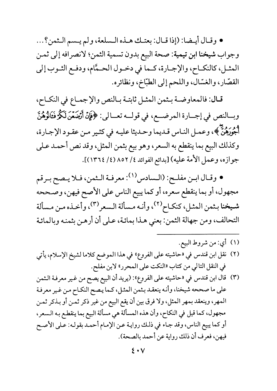 (¬٣) قال ابن قندس في «حاشيته على الفروع»: (يريد أن البيع يصح من غير معرفة الثمن على ما صححه شيخنا، وأنه ينعقد بثمن المثل، كما يصح النكاح من غير معرفة المهر، وينعقد بمهر المثل، ولا فرق بين أن يقع البيع من غير ذكر ثمن أو بذكر ثمن مجهول، كما قيل في النكاح، وأن هذه المسألة هي مسألة البيع بما ينقطع به السعر، أو كما يبيع الناس، وقد جاء في ذلك رواية عن الإمام أحمد بقوله: على الأصح فيهن، فعرف أن ذلك رواية عن أحمد بالصحة).