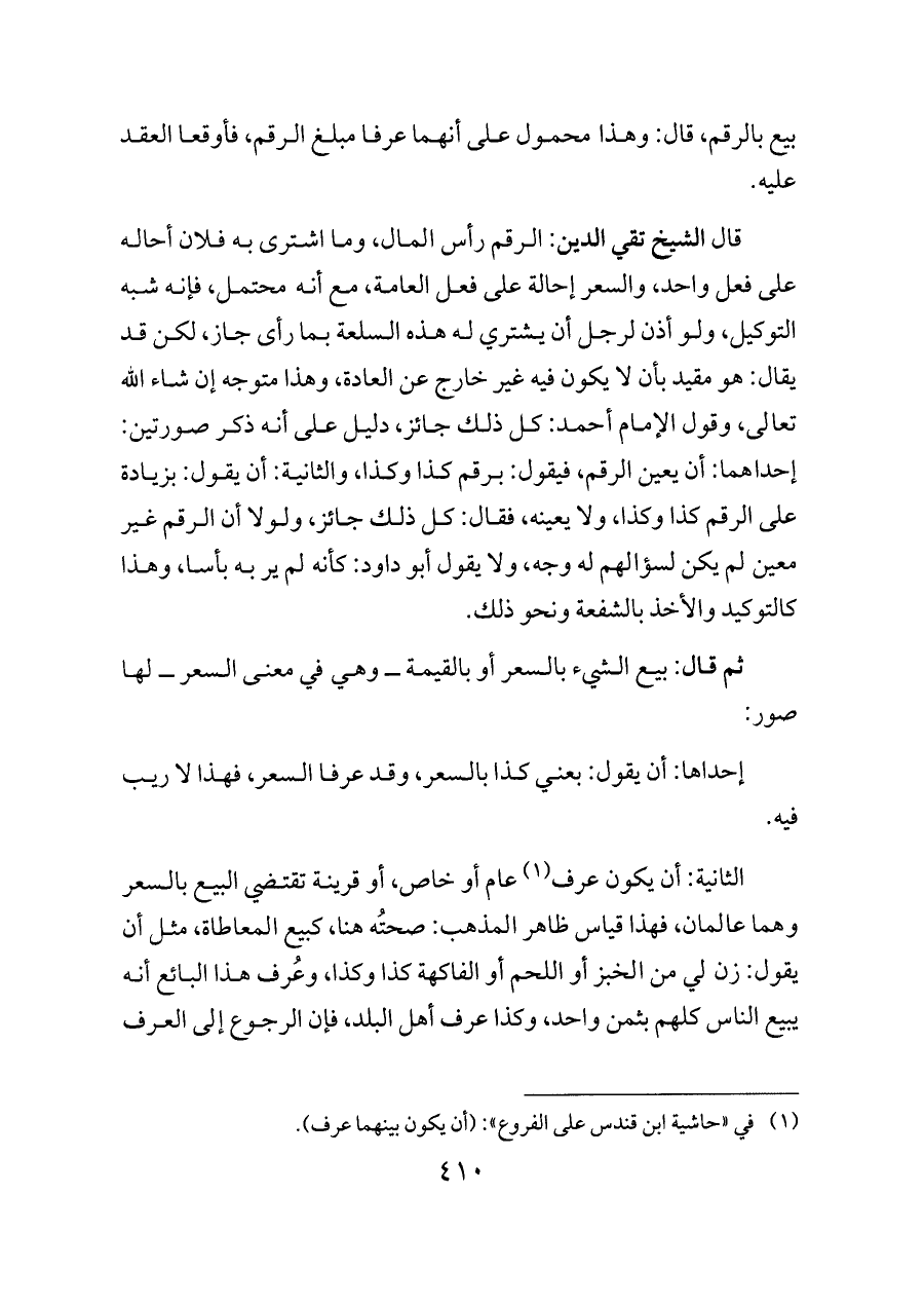 قال الشيخ تقي الدين: الرقم رأس المال، وما اشترى به فلان أحاله على فعل واحد، والسعر إحالة على فعل العامة، مع أنه محتمل، فإنه شبه التوكيل، ولو أذن لرجل أن يشتري له هذه السلعة بما رأى جاز، لكن قد يقال: هو مقيد بأن لا يكون فيه غير خارج عن العادة، وهذا متوجه إن شاء الله تعالى، وقول الإمام أحمد: كل ذلك جائز، دليل على أنه ذكر صورتين: إحداهما: أن يعين الرقم، فيقول: برقم كذا وكذا، والثانية: أن يقول: بزيادة على الرقم كذا وكذا، ولا يعينه، فقال: كل ذلك جائز، ولولا أن الرقم غير معين لم يكن لسؤالهم له وجه، ولا يقول أبو داود: كأنه لم ير به بأسا، وهذا كالتوكيد والأخذ بالشفعة ونحو ذلك.