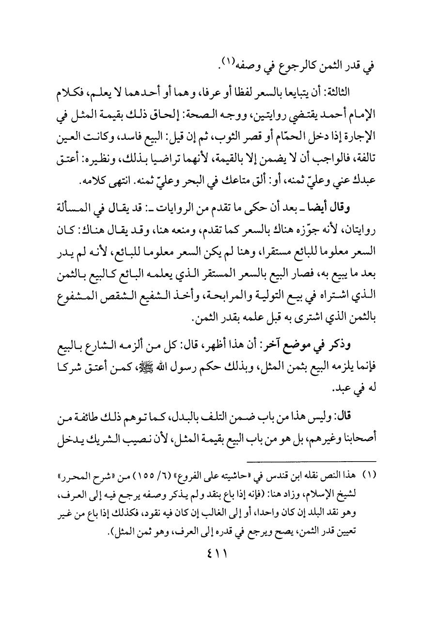 (¬١) هذا النص نقله ابن قندس في «حاشيته على الفروع» (٦/ ١٥٥) من «شرح المحرر» لشيخ الإسلام، وزاد هنا: (فإنه إذا باع بنقد ولم يذكر وصفه يرجع فيه إلى العرف، وهو نقد البلد إن كان واحدا، أو إلى الغالب إن كان فيه نقود، فكذلك إذا باع من غير تعيين قدر الثمن، يصح ويرجع في قدره إلى العرف، وهو ثمن المثل).