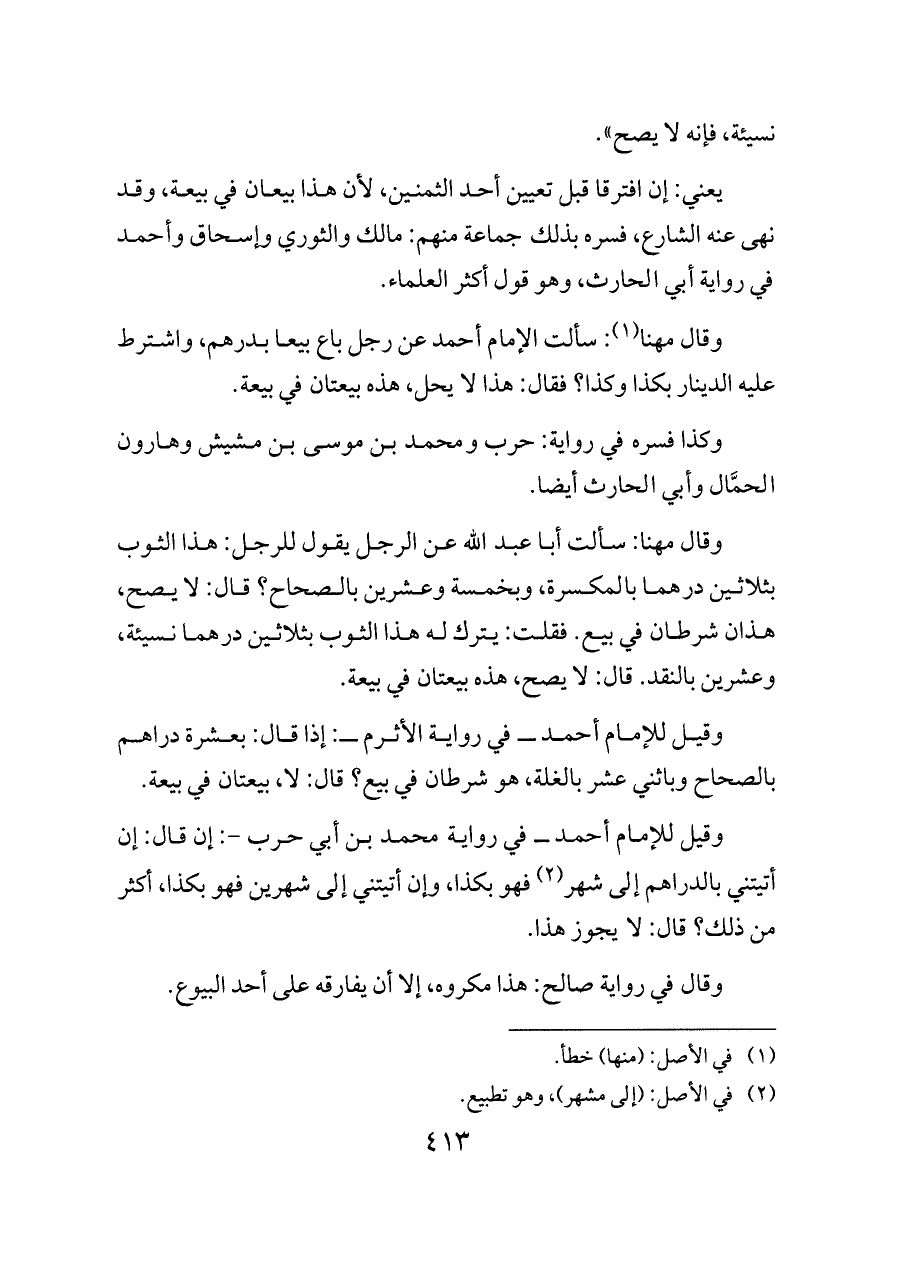 وقال مهنا: سألت أبا عبد الله عن الرجل يقول للرجل: هذا الثوب بثلاثين درهما بالمكسرة، وبخمسة وعشرين بالصحاح؟ قال: لا يصح، هذان شرطان في بيع. فقلت: يترك له هذا الثوب بثلاثين درهما نسيئة، وعشرين بالنقد. قال: لا يصح، هذه بيعتان في بيعة.