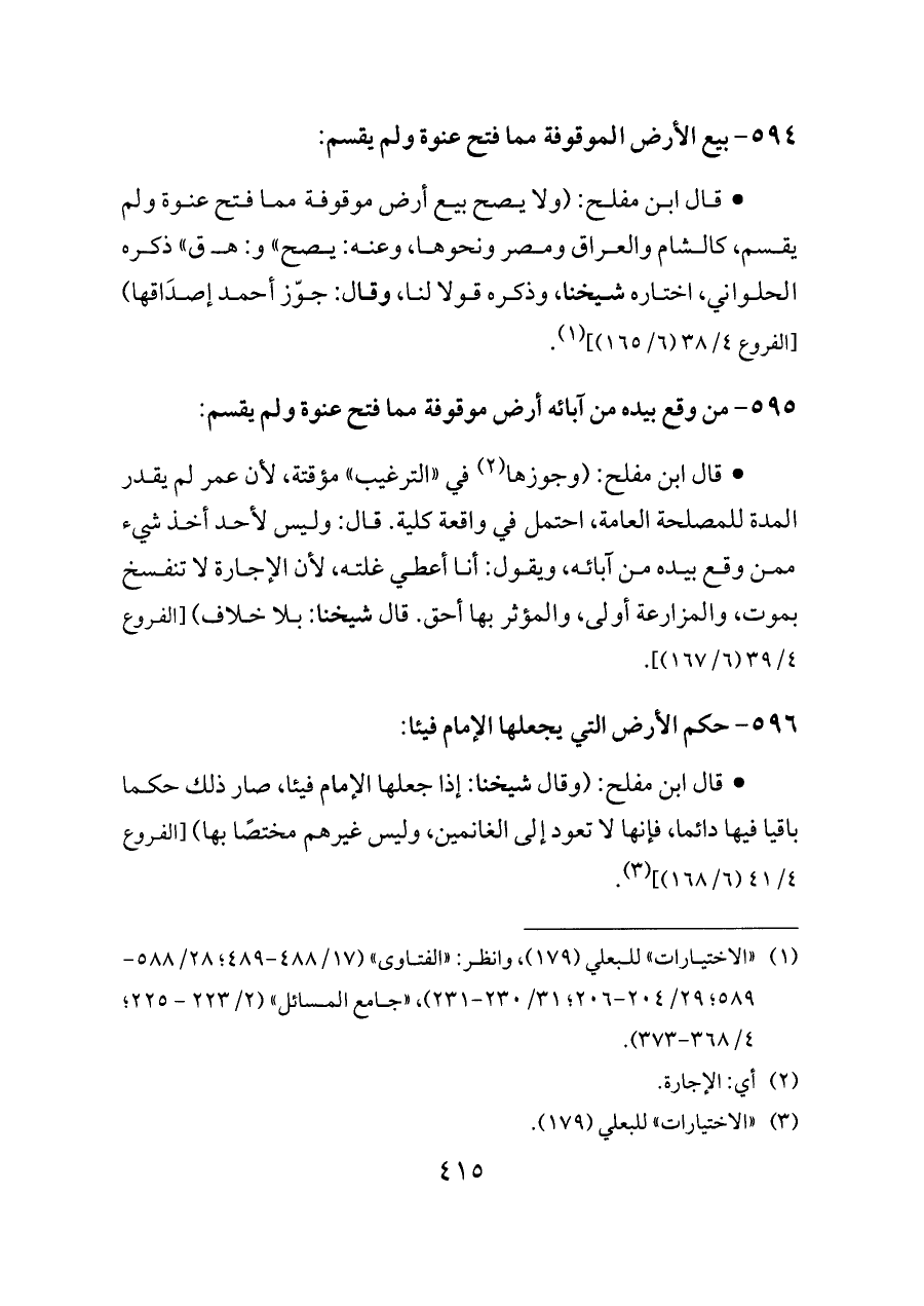 - قال ابن مفلح: (وقال شيخنا: إذا جعلها الإمام فيئا، صار ذلك حكما باقيا فيها دائما، فإنها لا تعود إلى الغانمين، وليس غيرهم مختصًا بها) [الفروع ٤/ ٤١ (٦/ ١٦٨)] (¬٣).