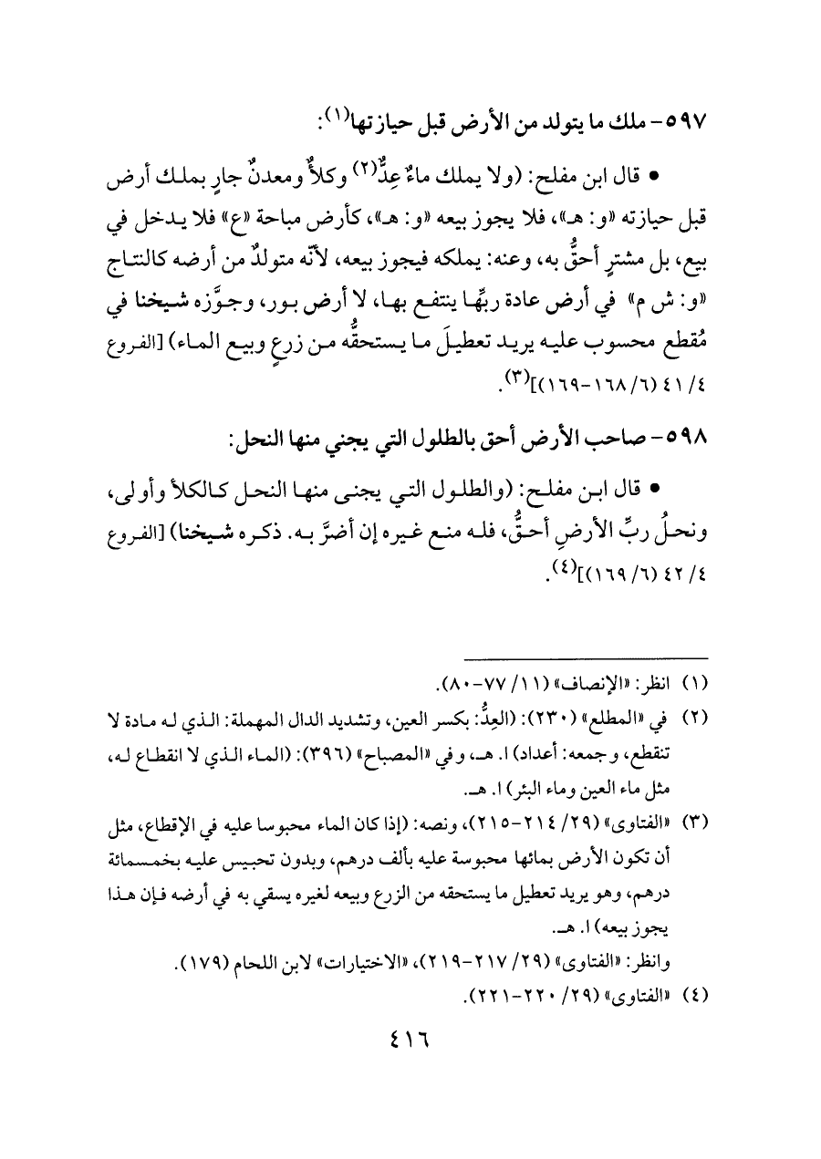 - قال ابن مفلح: (ولا يملك ماءٌ عِدٌّ (¬٢) وكلأٌ ومعدنٌ جارٍ بملك أرض قبل حيازته «و: هـ»، فلا يجوز بيعه «و: هـ»، كأرض مباحة «ع» فلا يدخل في بيع، بل مشترٍ أحقُّ به، وعنه: يملكه فيجوز بيعه، لأنّه متولدٌ من أرضه كالنتاج «و: ش م» في أرض عادة ربِّها ينتفع بها، لا أرض بور، وجوَّزه شيخنا في مُقطع محسوب عليه يريد تعطيلَ ما يستحقُّه من زرعٍ وبيع الماء) [الفروع ٤/ ٤١ (٦/ ١٦٨ - ١٦٩)] (¬٣).