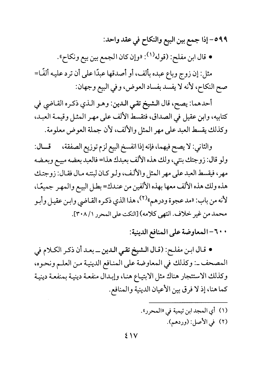 - قال ابن مفلح: (قال الشيخ تقي الدين ــ بعد أن ذكر الكلام في المصحف ــ: وكذلك في المعاوضة على المنافع الدينية من العلم ونحوه، وكذلك الاستئجار هناك مثل الابتياع هنا، وإبدال منفعة دينية بمنفعة دينية كما هنا، إذ لا فرق بين الأعيان الدينية والمنافع.