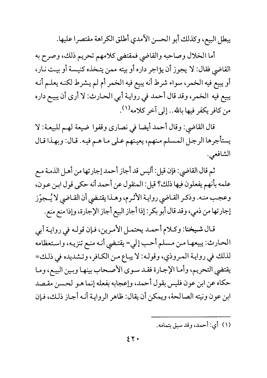 قال شيخنا: وكلام أحمد يحتمل الأمرين، فإن قوله في رواية أبي الحارث: يبيعها من مسلم أحب إلي= يقتضي أنه منع تنزيه، واستعظامه لذلك في رواية المروذي، وقوله: لا يباع من الكافر، وتشديده في ذلك= يقتضي التحريم، وأما الإجارة فقد سوى الأصحاب بينها وبين البيع، وما حكاه عن ابن عون فليس بقول أحمد، وإعجابه بفعله إنما هو لحسن مقصد ابن عون ونيته الصالحة، ويمكن أن يقال: ظاهر الرواية أنه أجاز ذلك، فإن