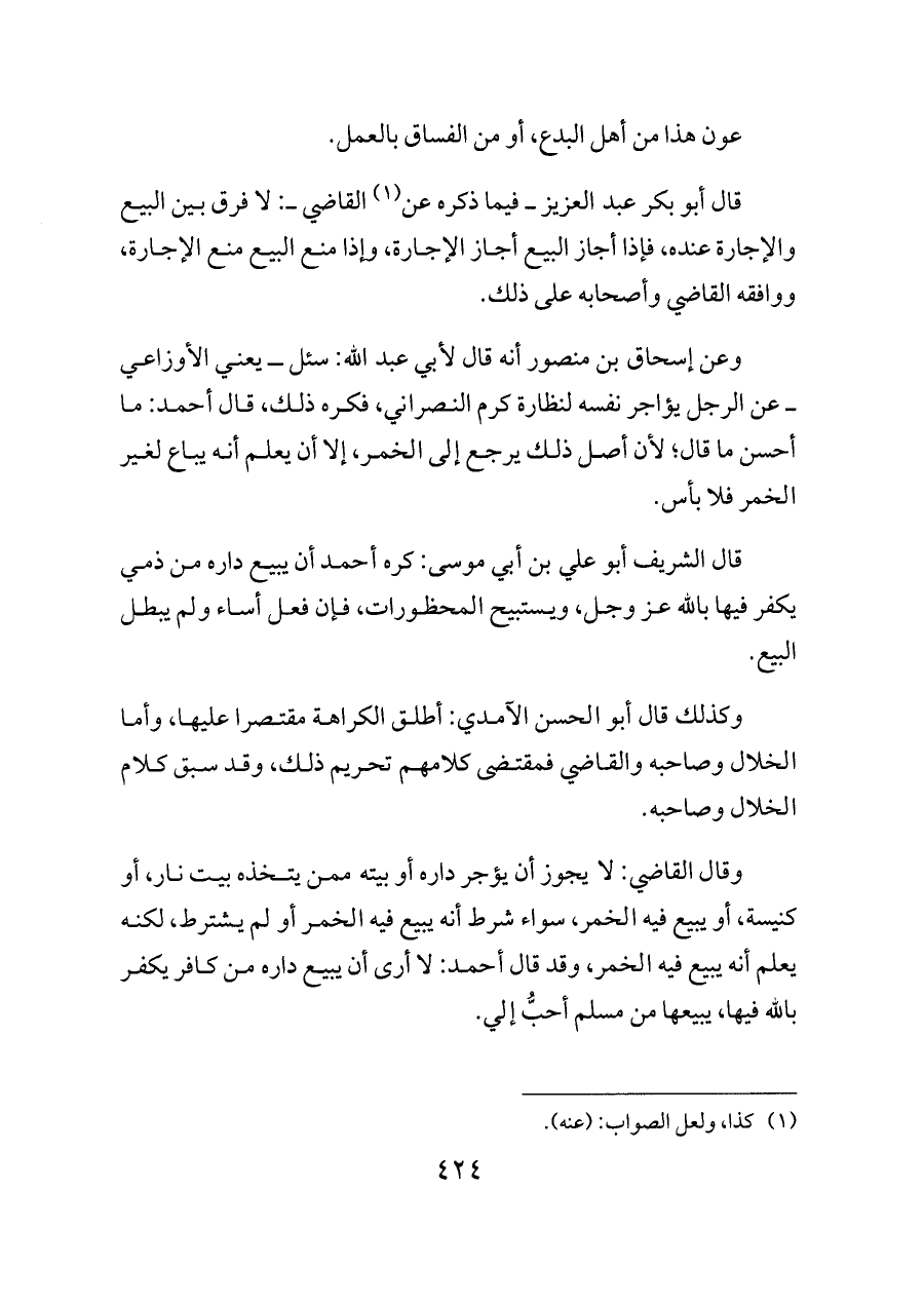 وقال القاضي: لا يجوز أن يؤجر داره أو بيته ممن يتخذه بيت نار، أو كنيسة، أو يبيع فيه الخمر، سواء شرط أنه يبيع فيه الخمر أو لم يشترط، لكنه يعلم أنه يبيع فيه الخمر، وقد قال أحمد: لا أرى أن يبيع داره من كافر يكفر بالله فيها، يبيعها من مسلم أحبُّ إلي.