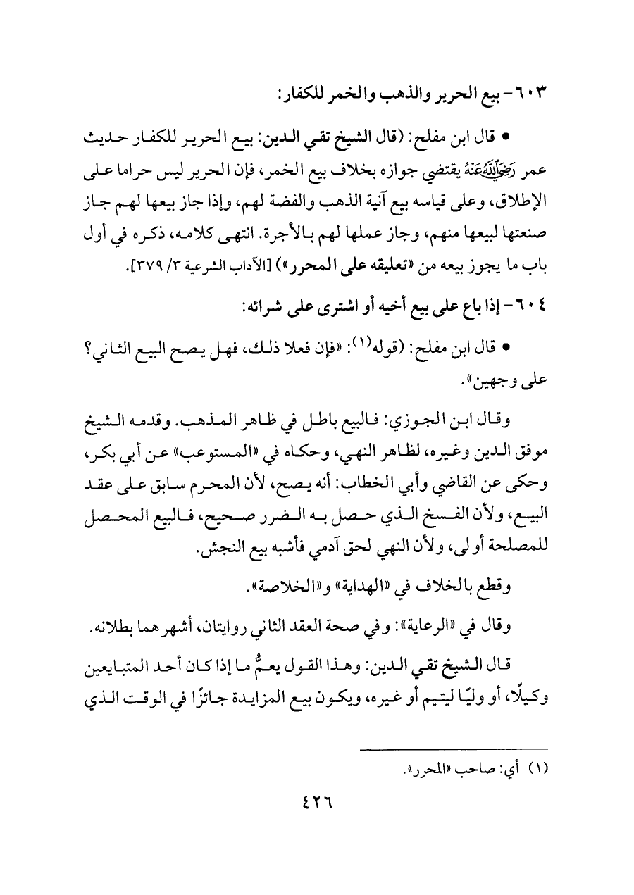- قال ابن مفلح: (قال الشيخ تقي الدين: بيع الحرير للكفار حديث عمر - رضي الله عنه - يقتضي جوازه بخلاف بيع الخمر، فإن الحرير ليس حراما على الإطلاق، وعلى قياسه بيع آنية الذهب والفضة لهم، وإذا جاز بيعها لهم جاز صنعتها لبيعها منهم، وجاز عملها لهم بالأجرة. انتهى كلامه، ذكره في أول باب ما يجوز بيعه من «تعليقه على المحرر») [الآداب الشرعية ٣/ ٣٧٩].