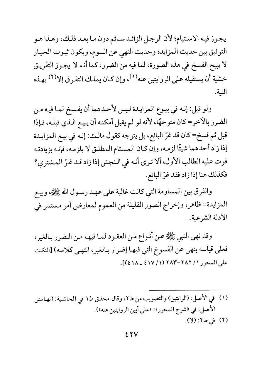 ولو قيل: إنه في بيوع المزايدة ليس لأحدهما أن يفسخ لما فيه من الضرر بالآخر= كان متوجهًا، لأنه لو لم يقبل أمكنه أن يبيع الذي قبله، فإذا قبل ثم فسخ= كان قد غرّ البائع، بل يتوجه كقول مالك: إنه في بيع المزايدة إذا زاد أحدهما شيئًا لزمه، وإن كان المستام المطلق لا يلزمه، فإنه بزيادته فوت عليه الطالب الأول، ألا ترى أنه في النجش إذا زاد قد غرّ المشتري؟ فكذلك هنا إذا زاد فقد غرّ البائع.