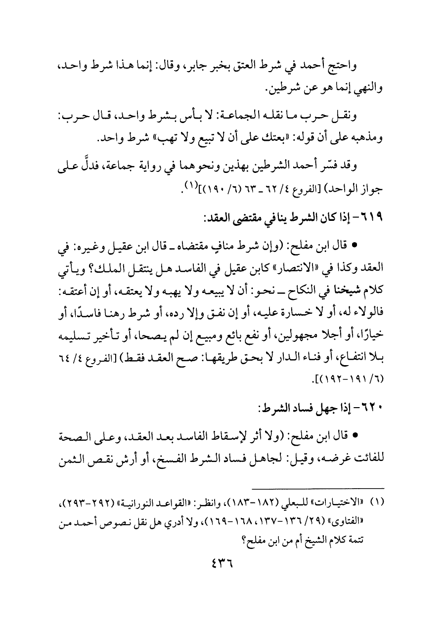 - قال ابن مفلح: (وإن شرط منافٍ مقتضاه ــ قال ابن عقيل وغيره: في العقد وكذا في «الانتصار» كابن عقيل في الفاسد هل ينتقل الملك؟ ويأتي كلام شيخنا في النكاح ــ نحو: أن لا يبيعه ولا يهبه ولا يعتقه، أو إن أعتقه: فالولاء له، أو لا خسارة عليه، أو إن نفق وإلا رده، أو شرط رهنا فاسدًا، أو خيارًا، أو أجلا مجهولين، أو نفع بائع ومبيع إن لم يصحا، أو تأخير تسليمه بلا انتفاع، أو فناء الدار لا بحق طريقها: صح العقد فقط) [الفروع ٤/ ٦٤ (٦/ ١٩١ - ١٩٢)].
