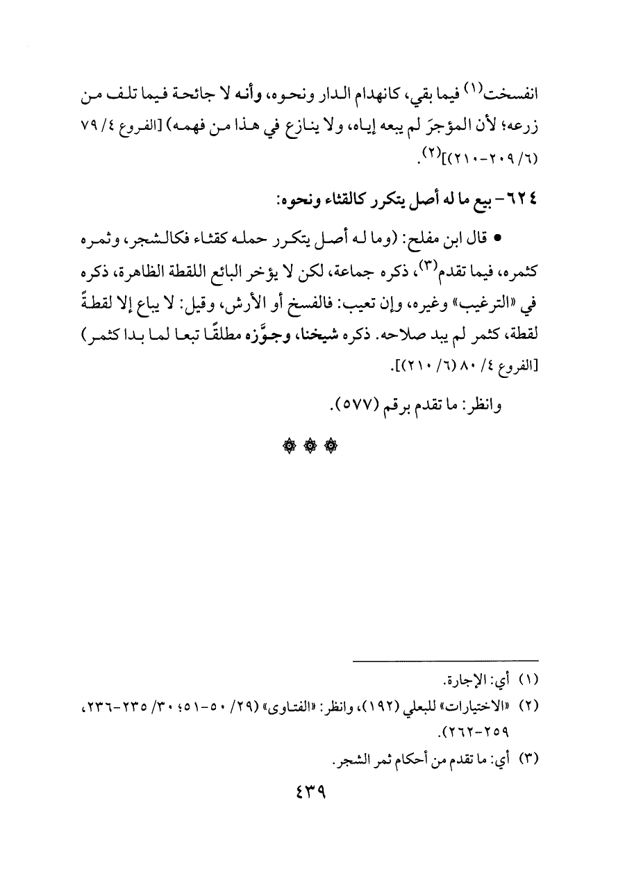 ٦٢٤ - بيع ما له أصل يتكرر كالقثاء ونحوه: